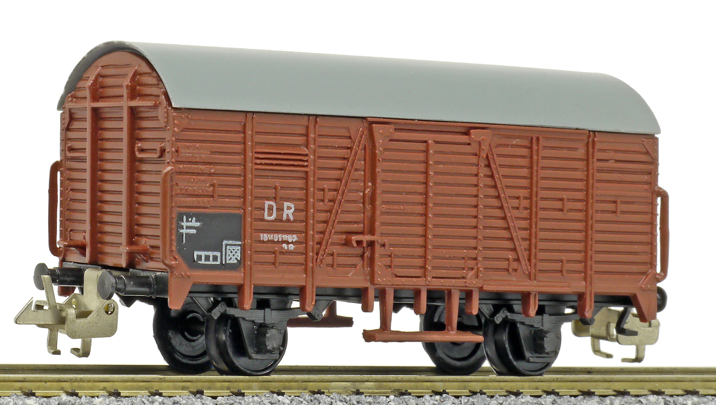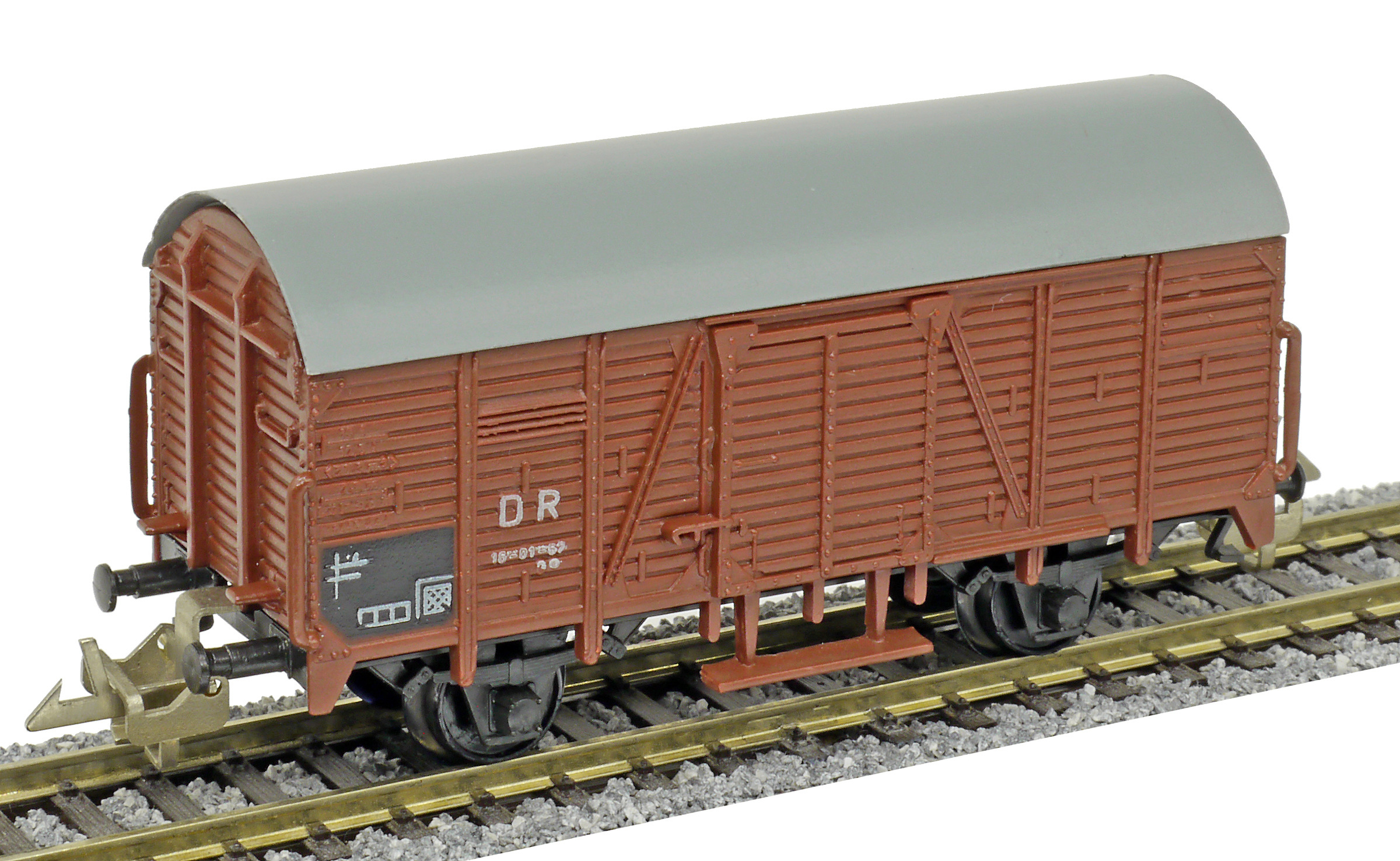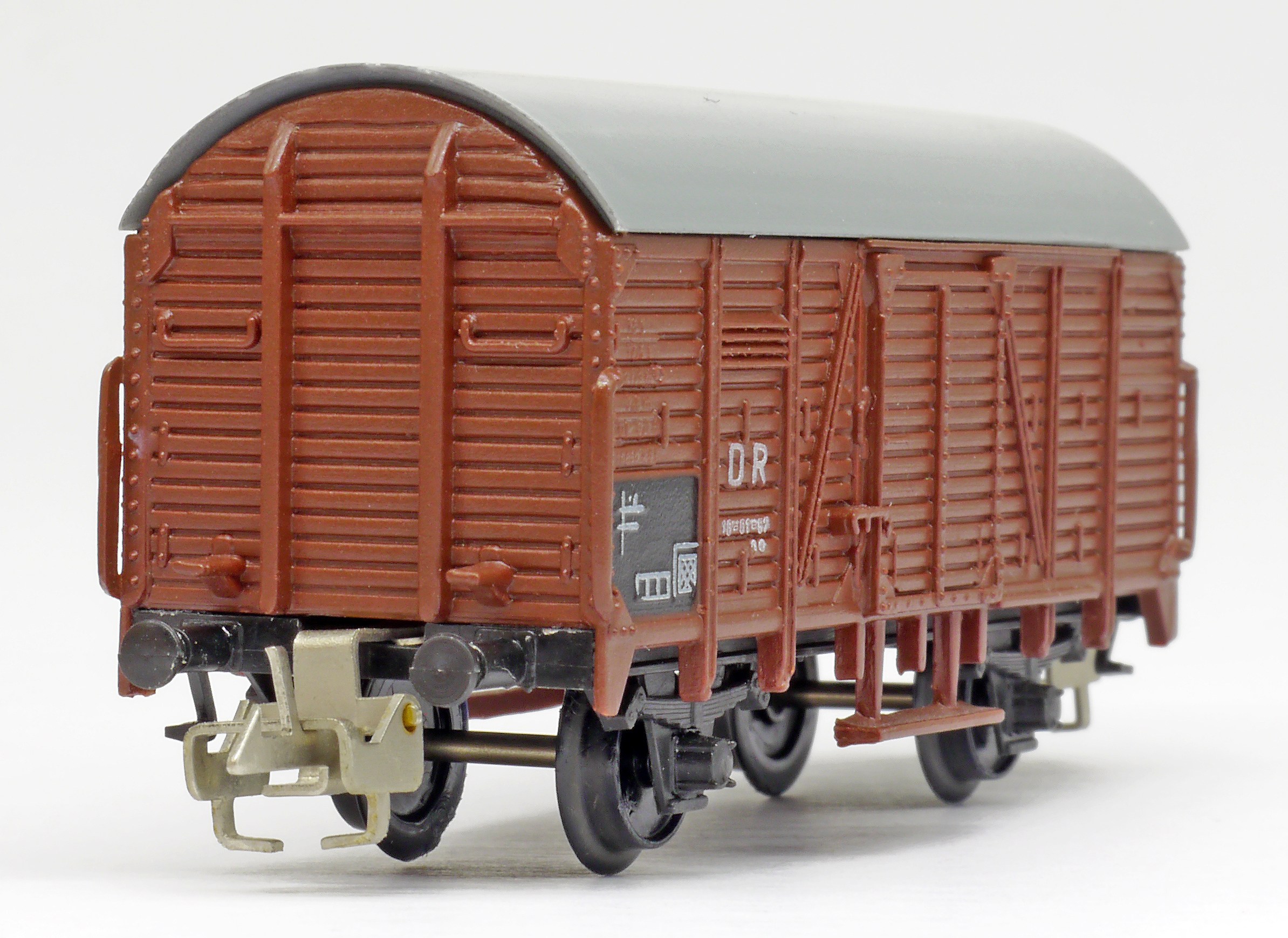 | krytý nákladní vůz červenohnědý s šedou střechou, bez brzd |