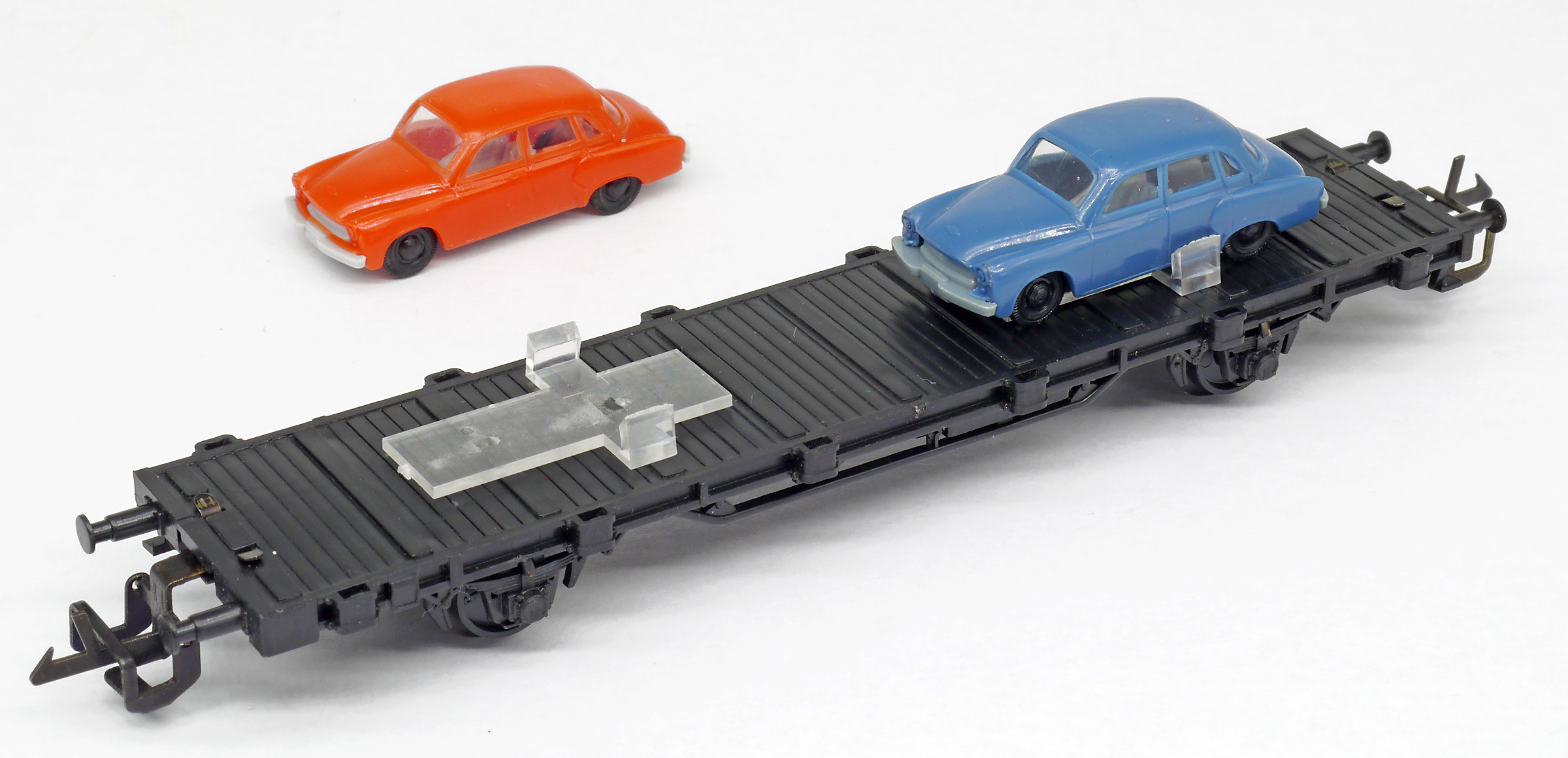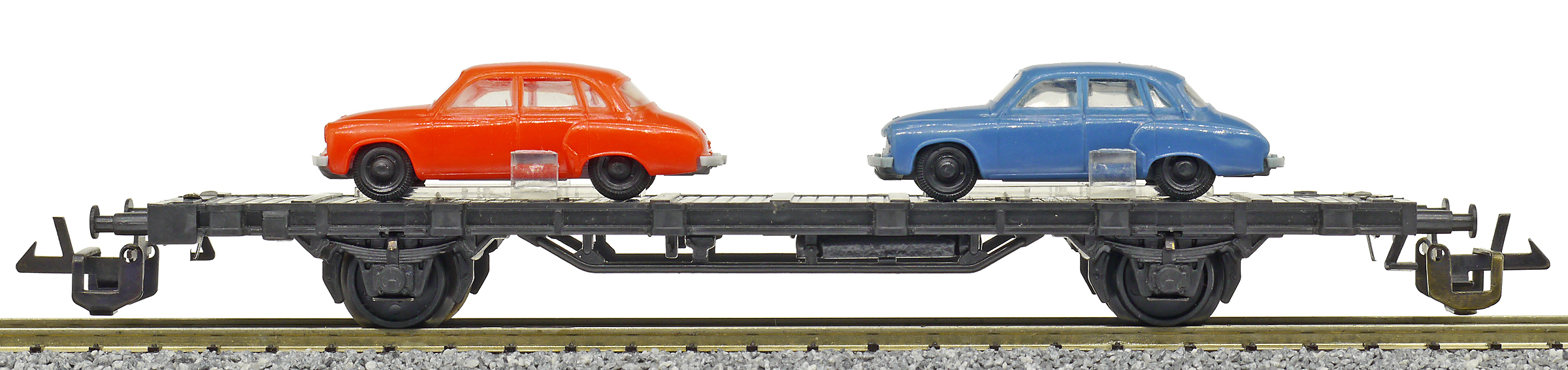 | Nákladní plošinový černý s nákladem dvou osobních automobilů Wartburg |