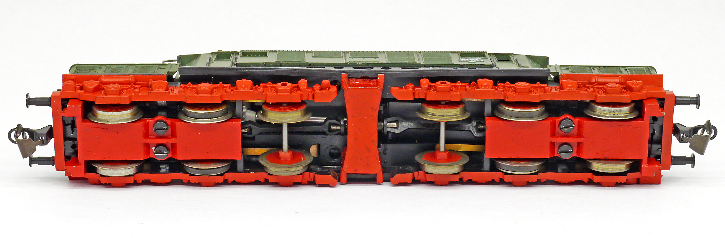 Popis   elektrická lokomotiva zelená s šedou střechou a červenými podvozky