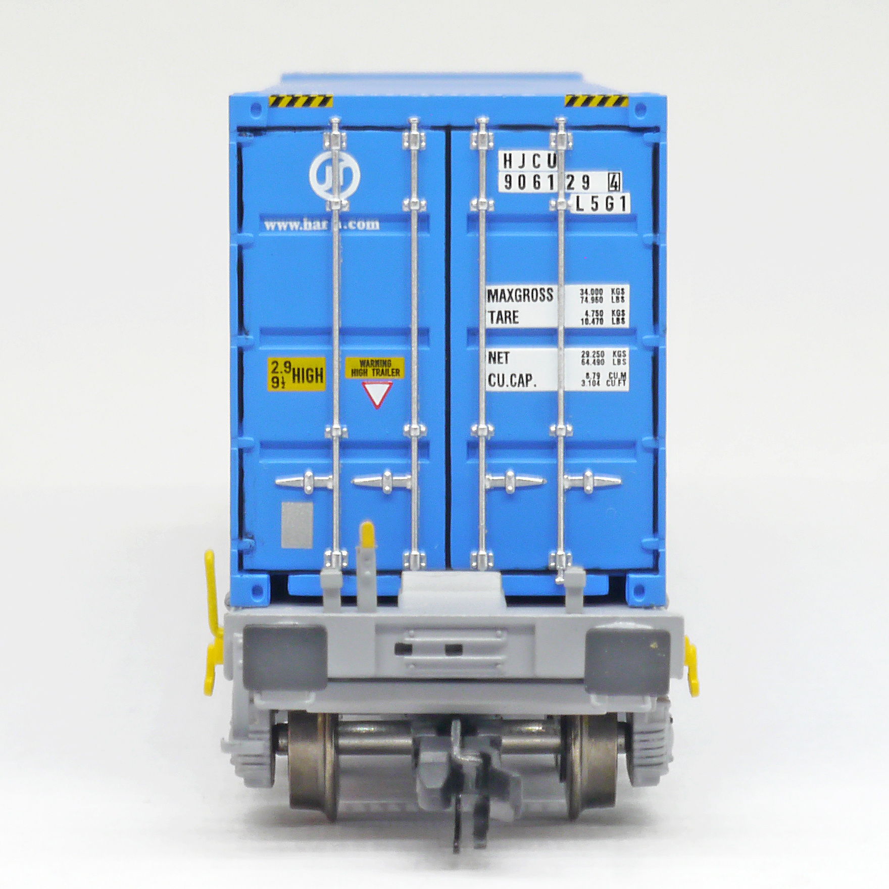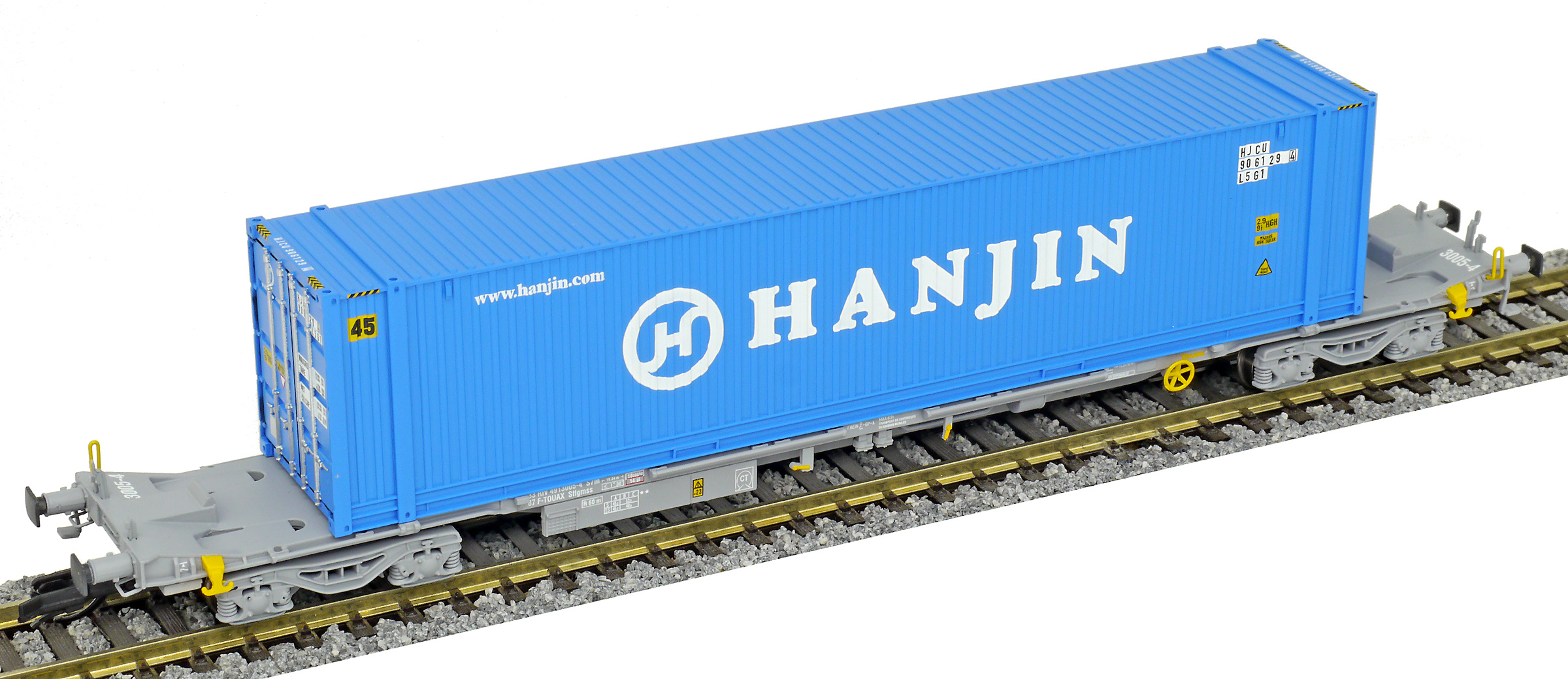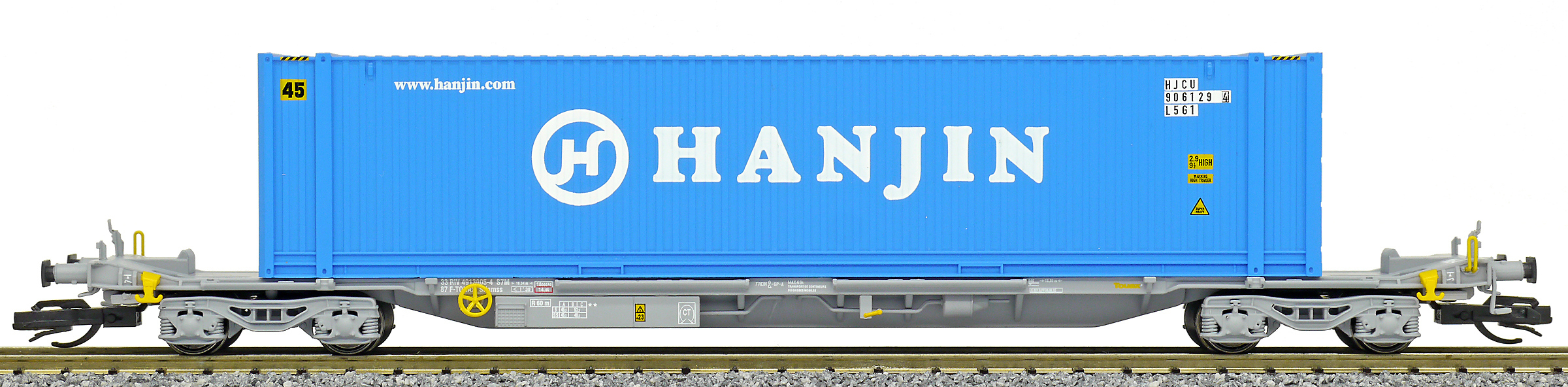 | kontejnerový vůz „IFA” šedý ložený 45' kontejnerem „HANJIN” |