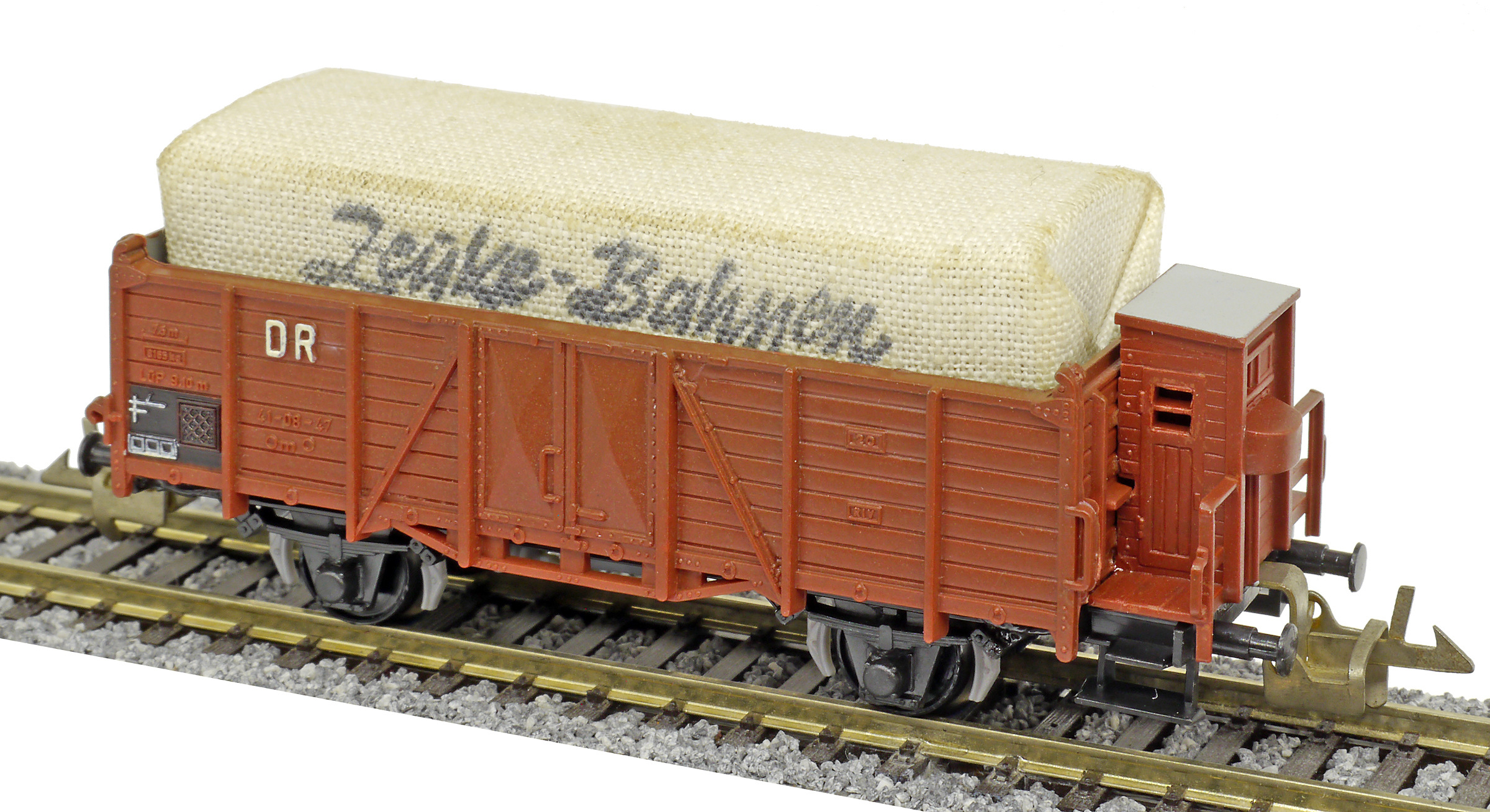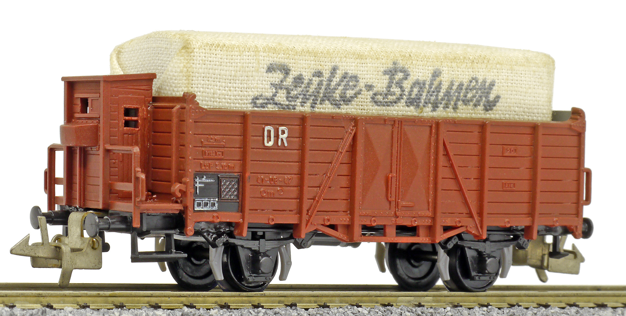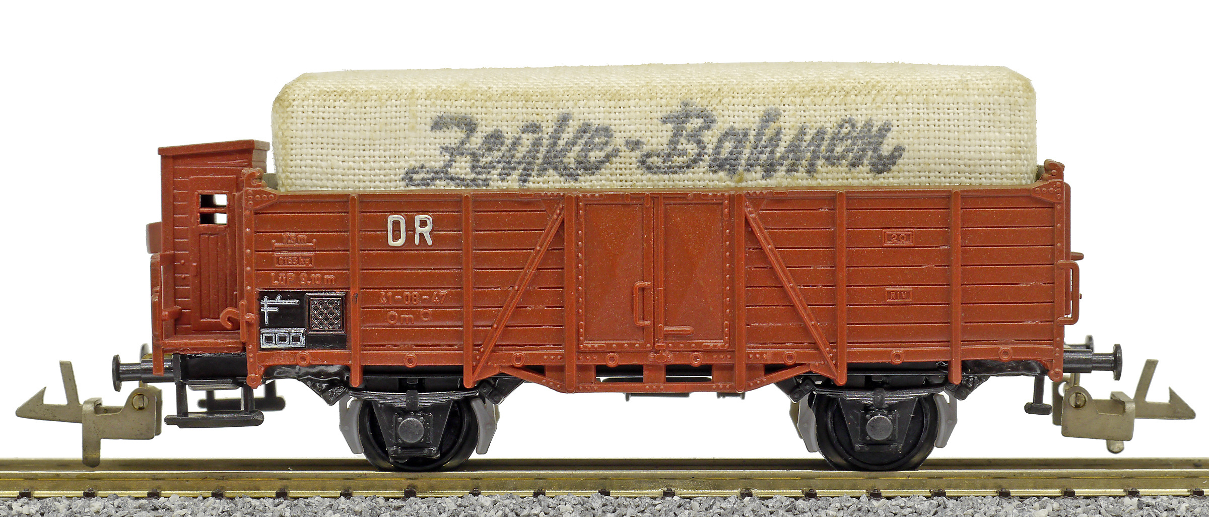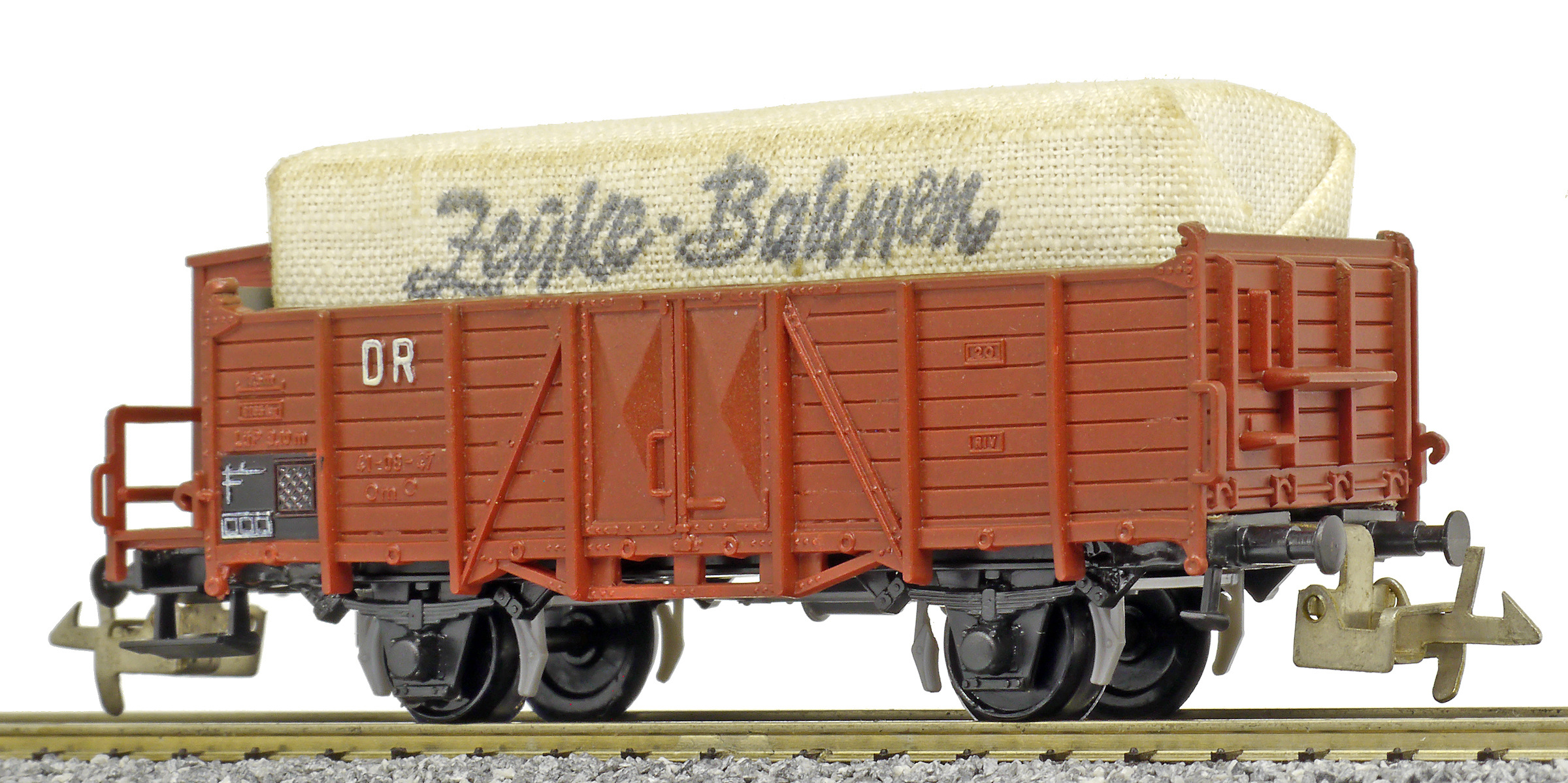| otevřený nákladní vůz červenohnědý s brzdařskou budkou a s plachtou „Zeuke-Bahnen“ |