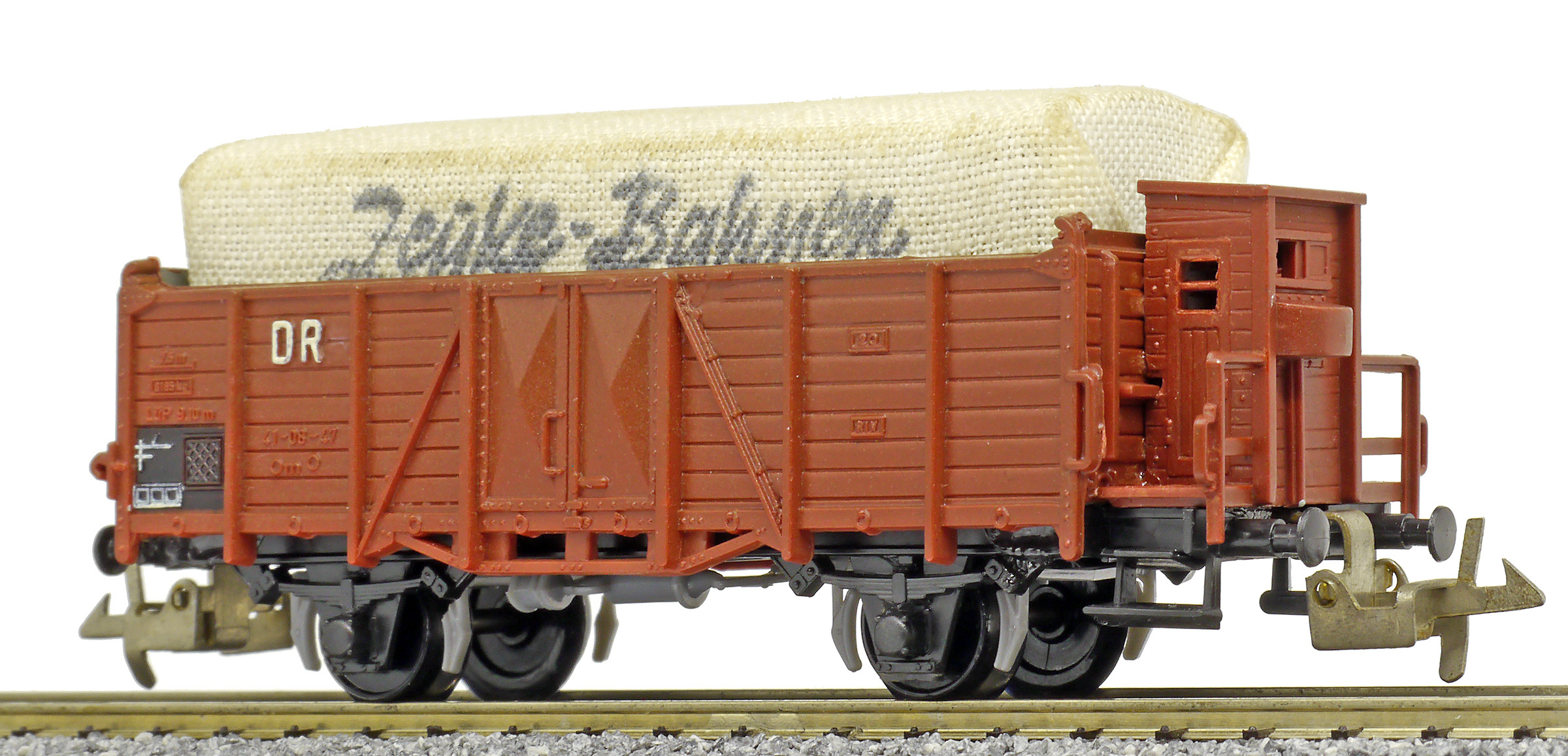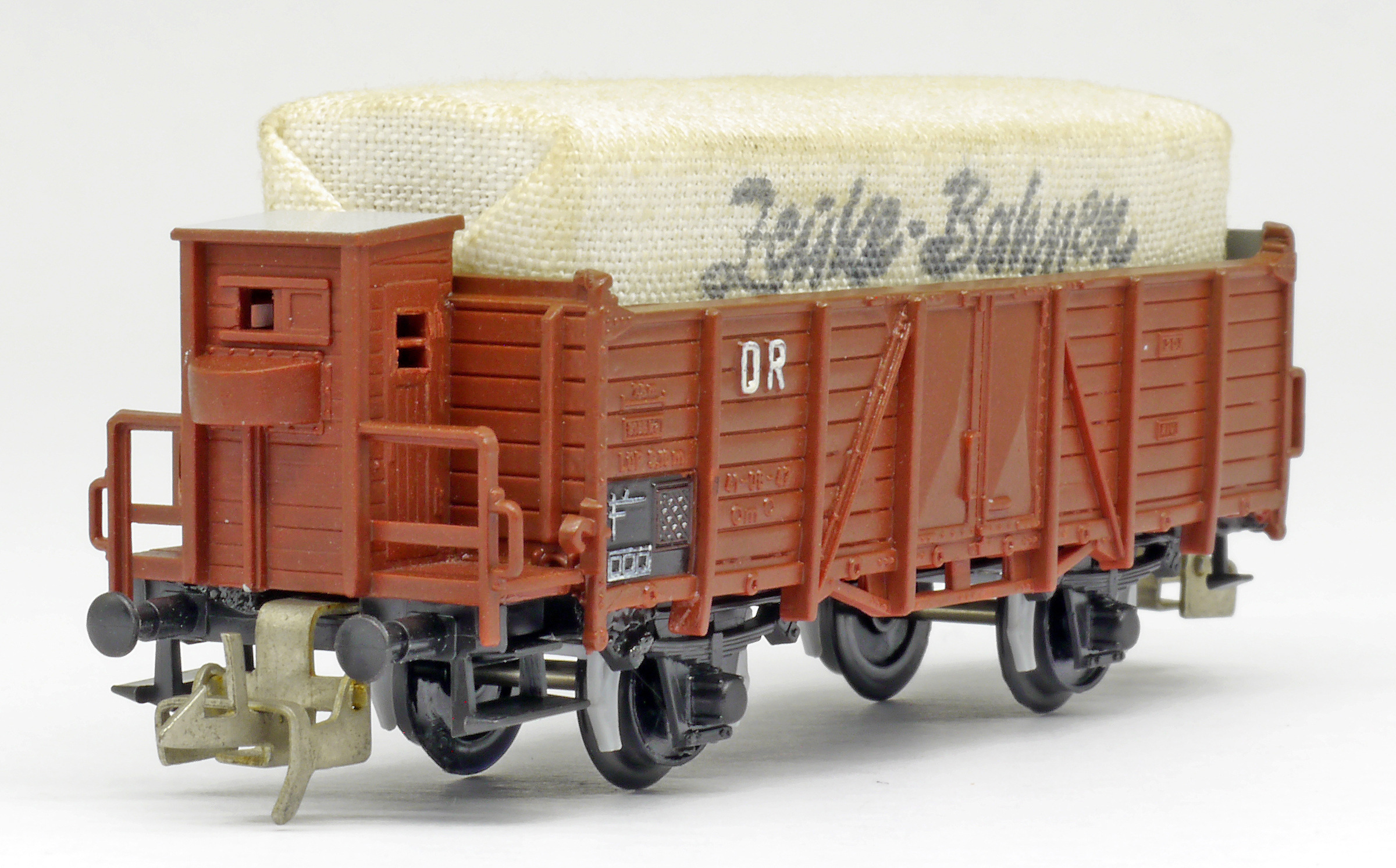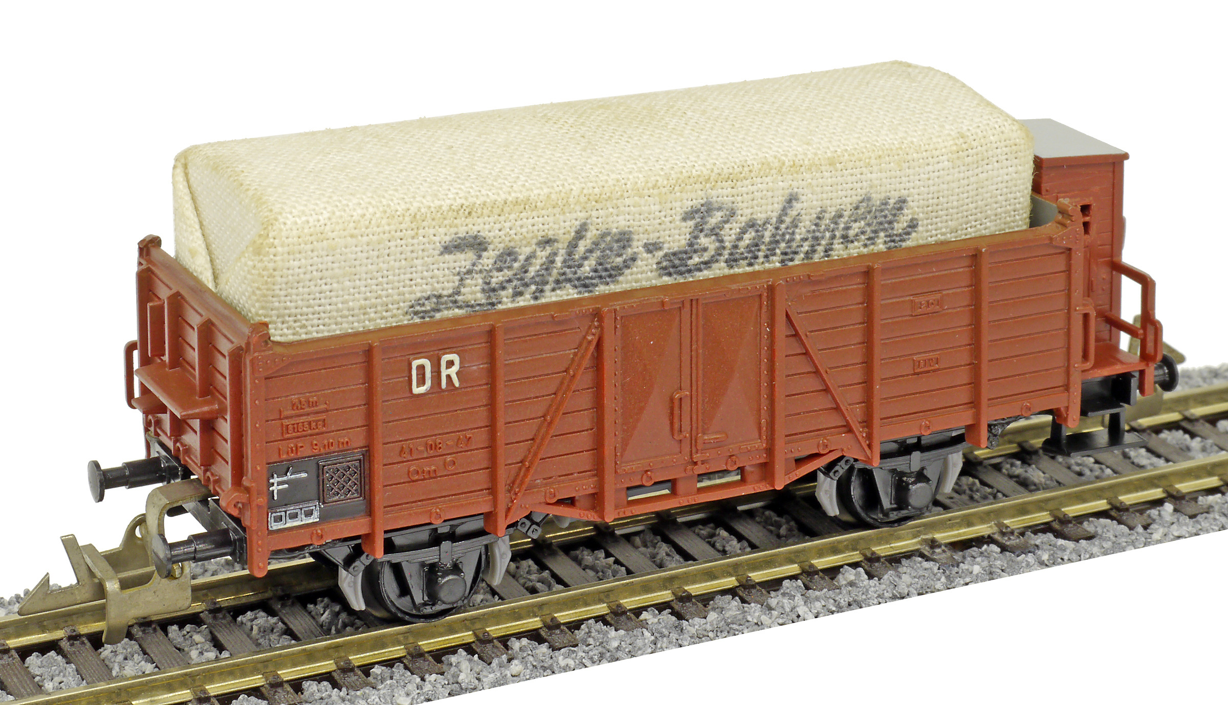 | otevřený nákladní vůz červenohnědý s brzdařskou budkou a s plachtou „Zeuke-Bahnen“ |