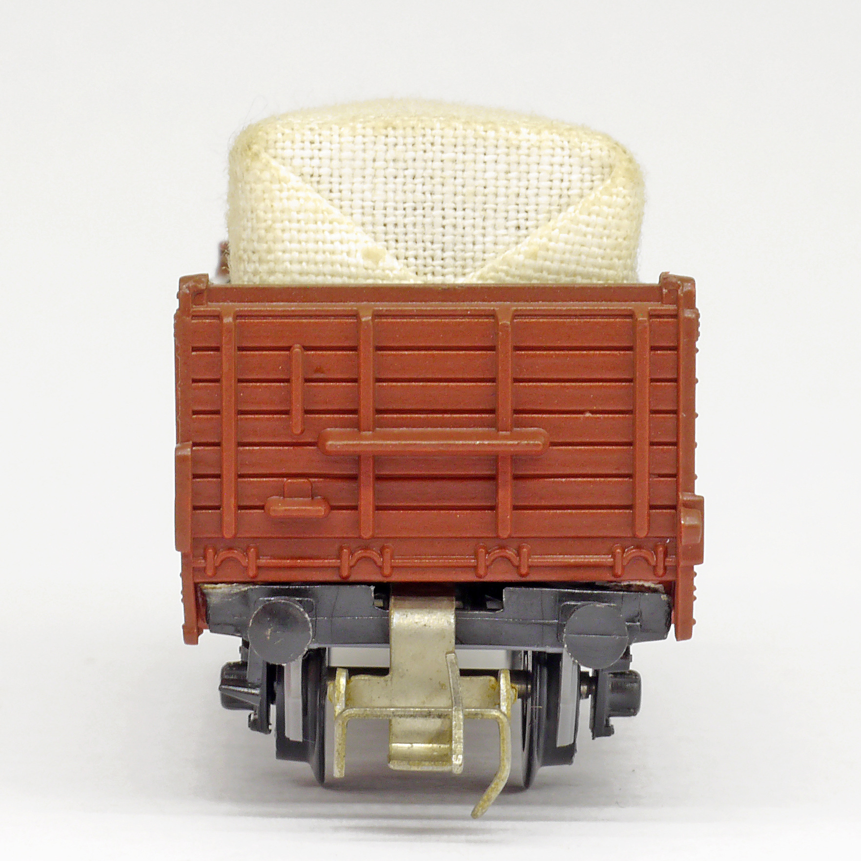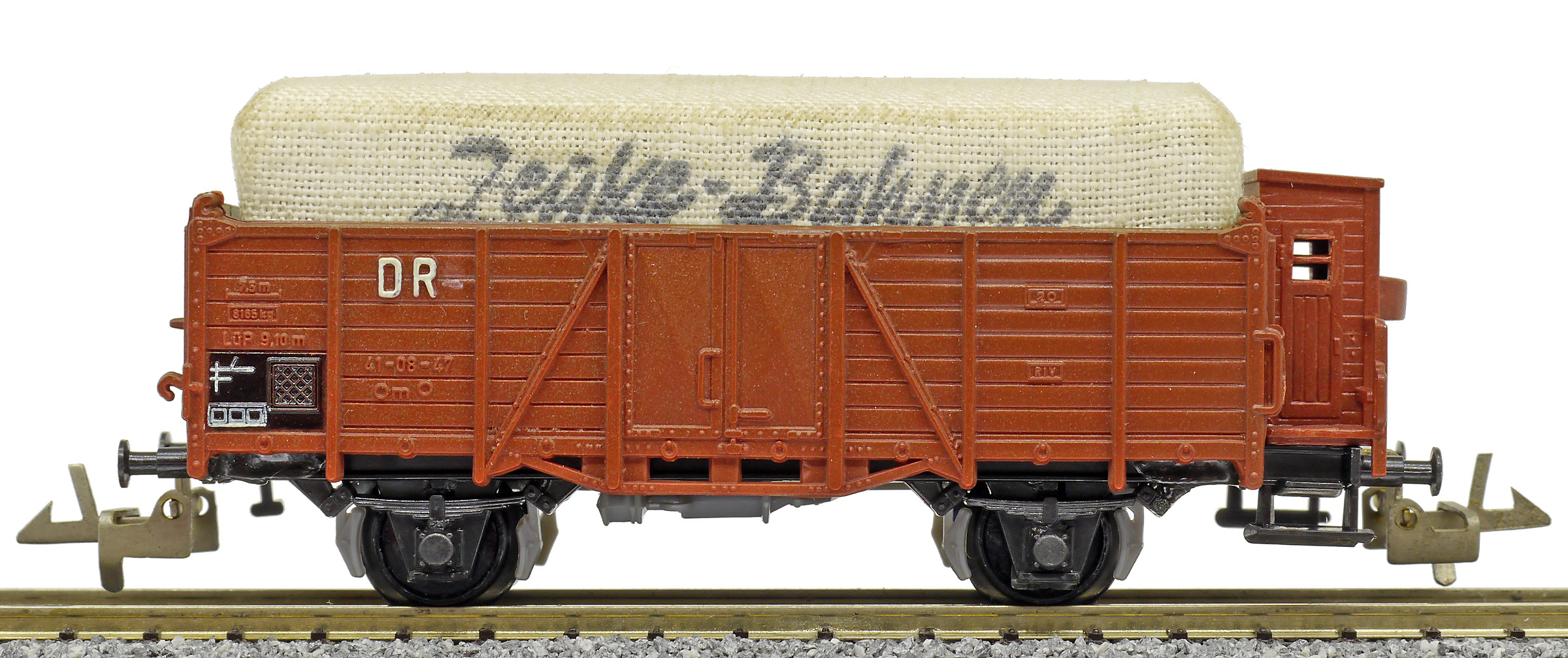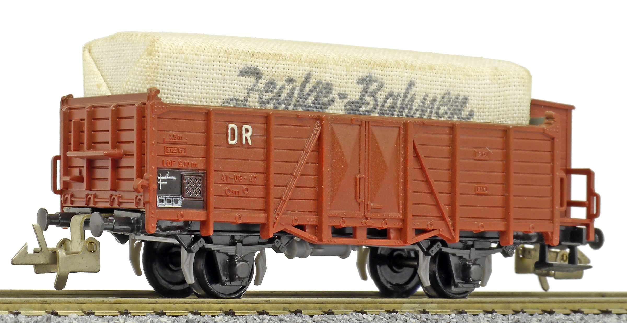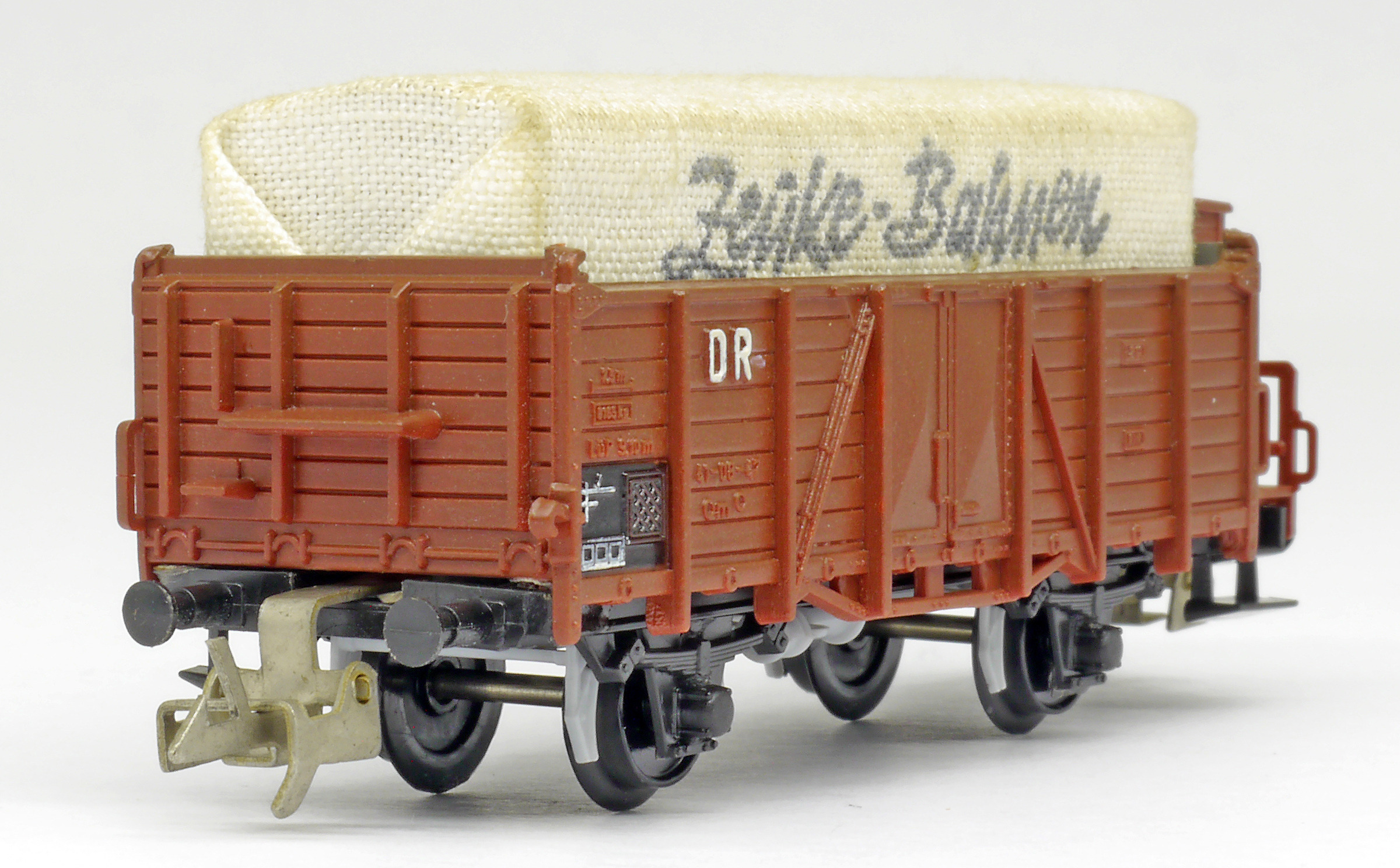 | otevřený nákladní vůz červenohnědý s brzdařskou budkou a s plachtou „Zeuke-Bahnen“ |