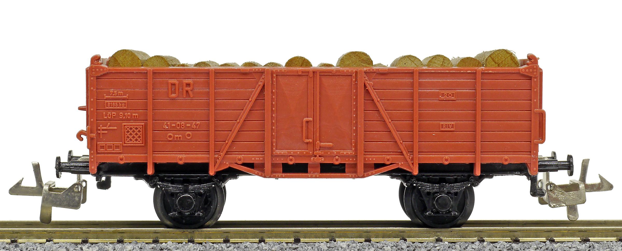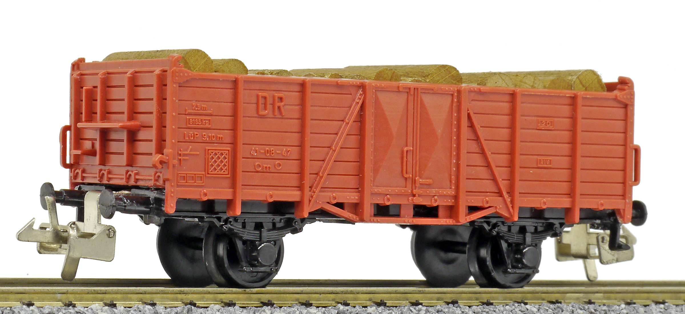| otevřený nákladní vůz červenohnědý nebo zelený s nákladem kulatiny |