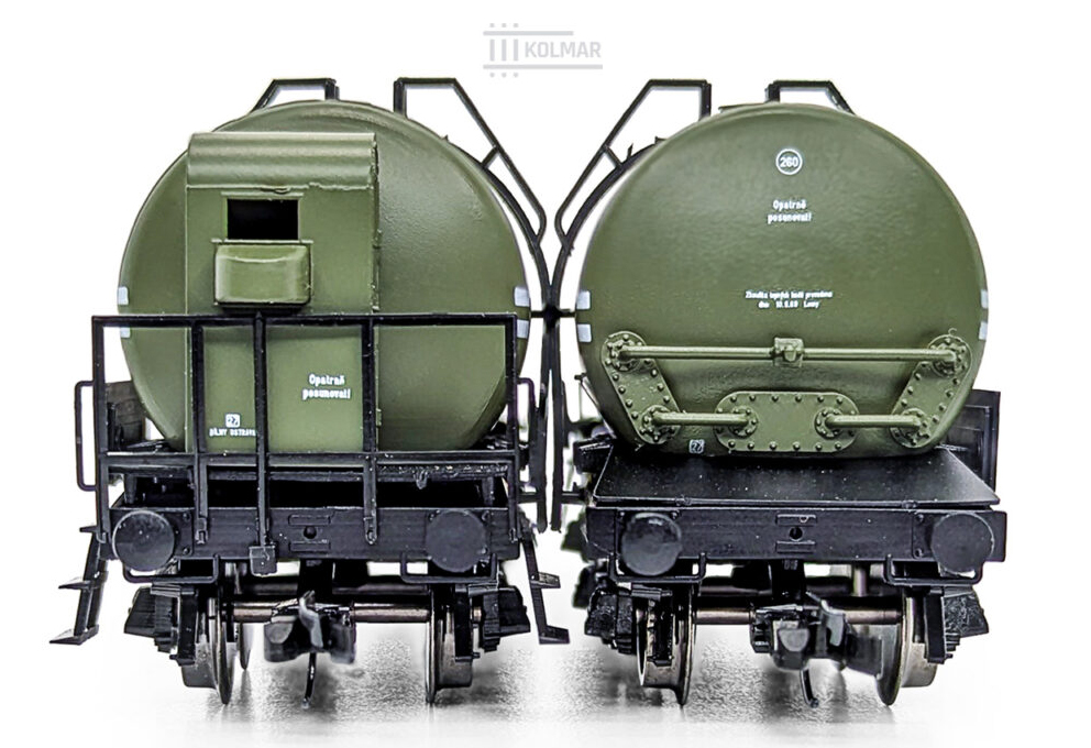 | set tří zelených kotlových vozů s brzdařskými budkami |