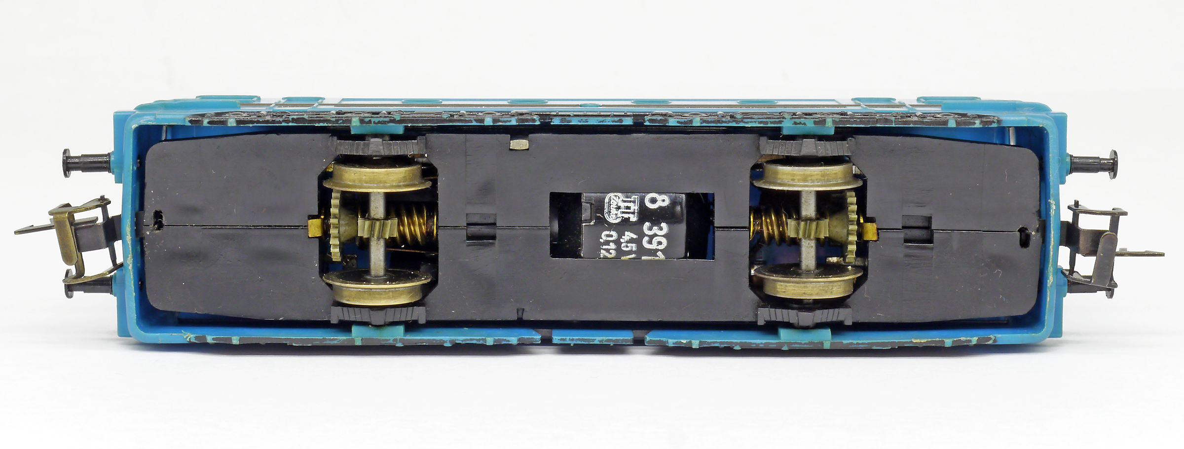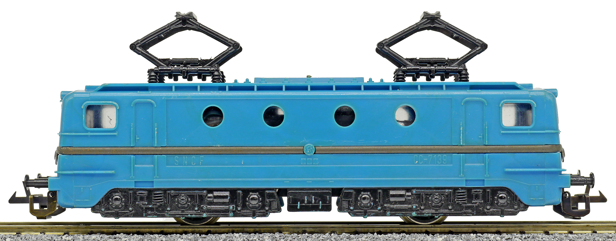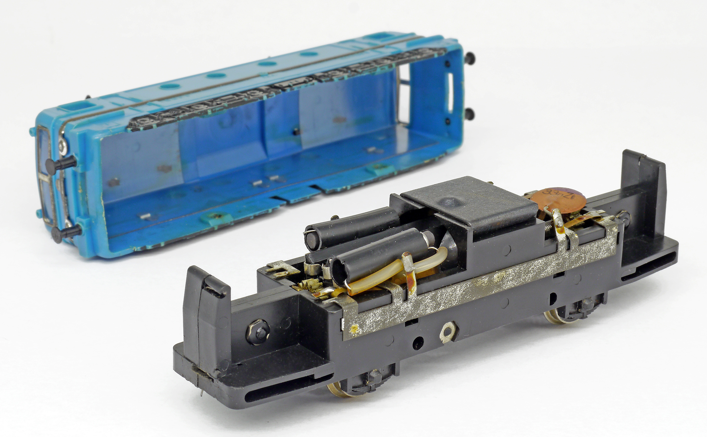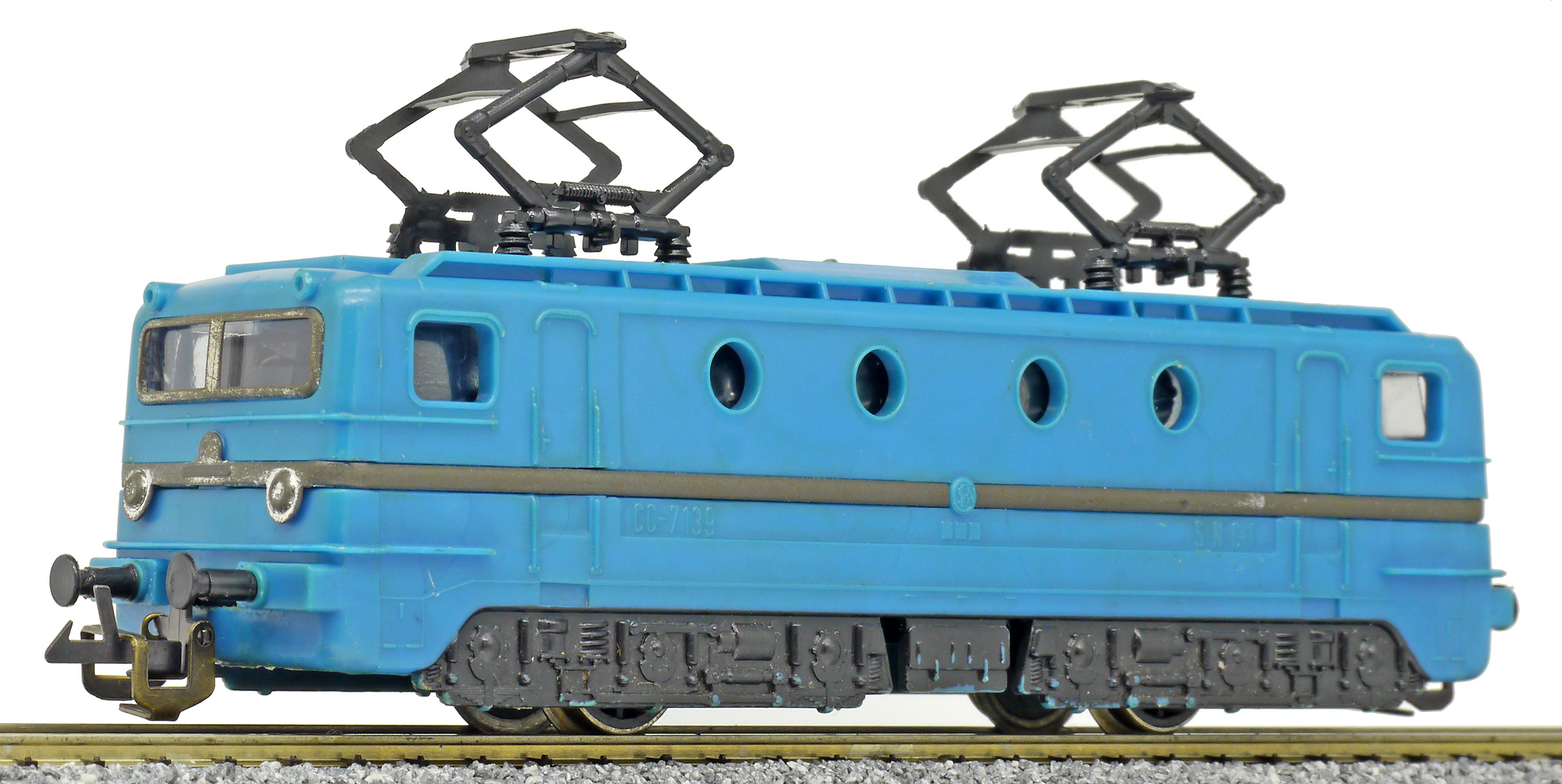 elektrická lokomotiva, různé barvy plastu, černé plastové pantografy a černá imitace pojezdu