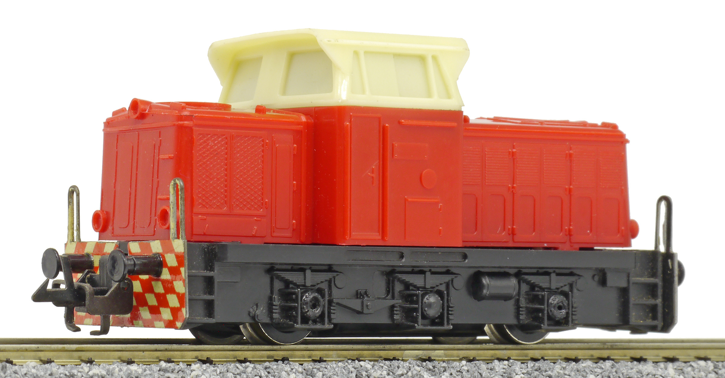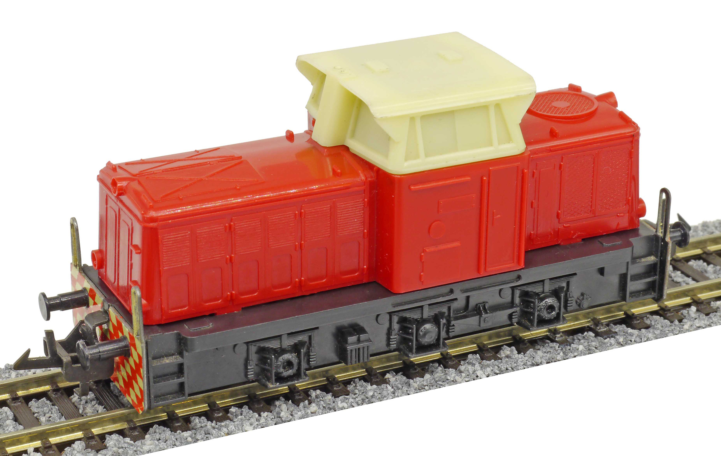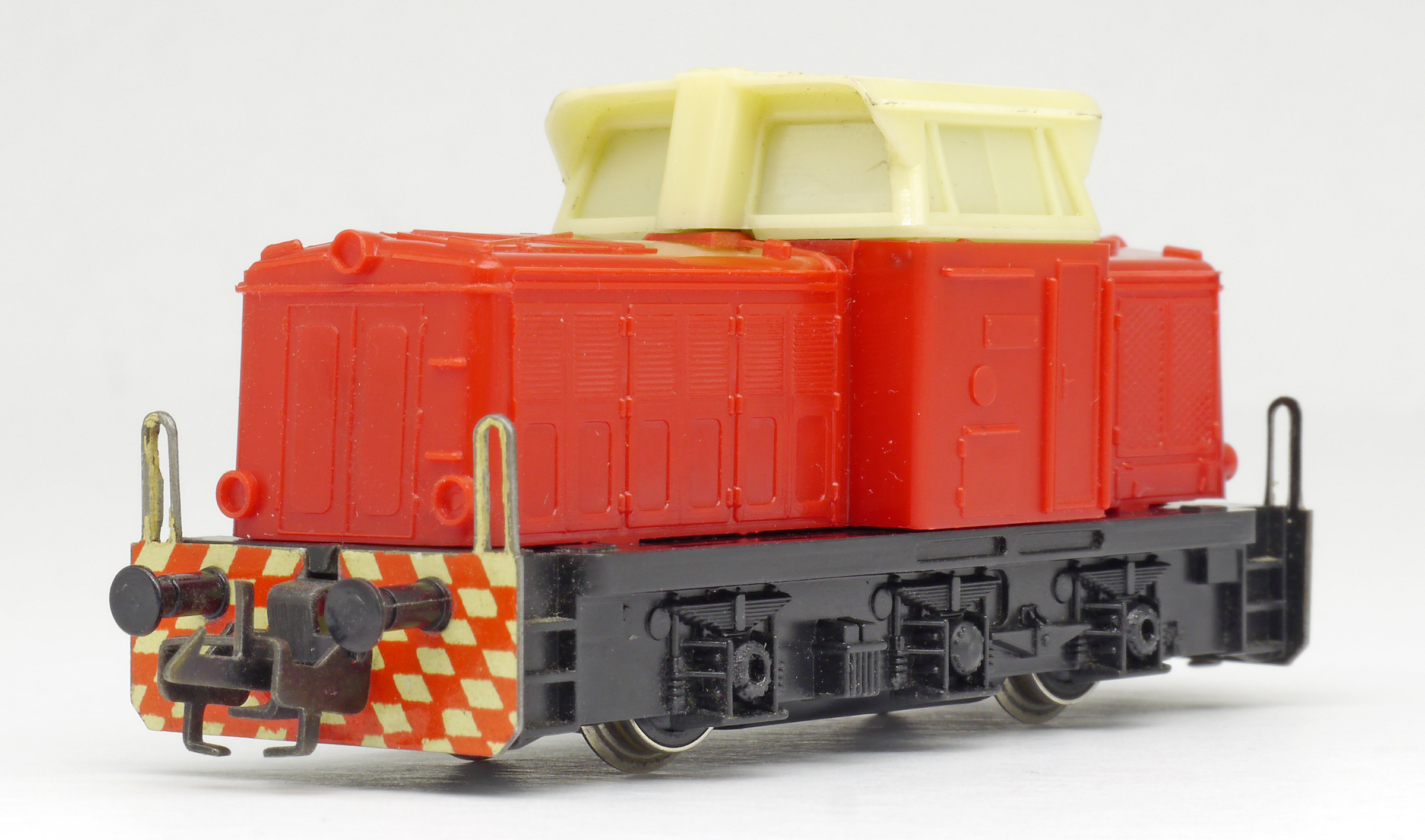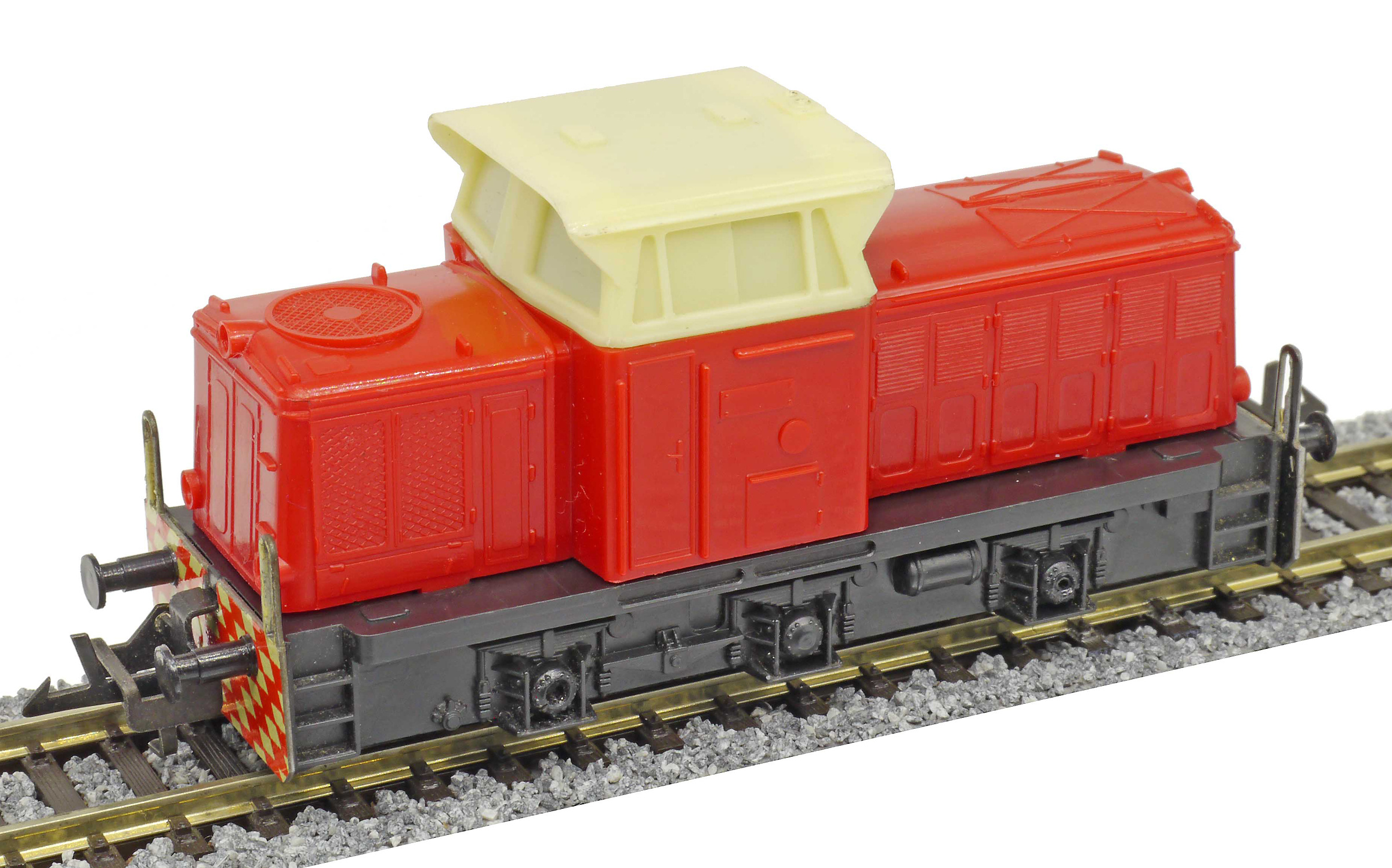 | dieselová lokomotiva v barvě plastu červená s černým pojezdem |
