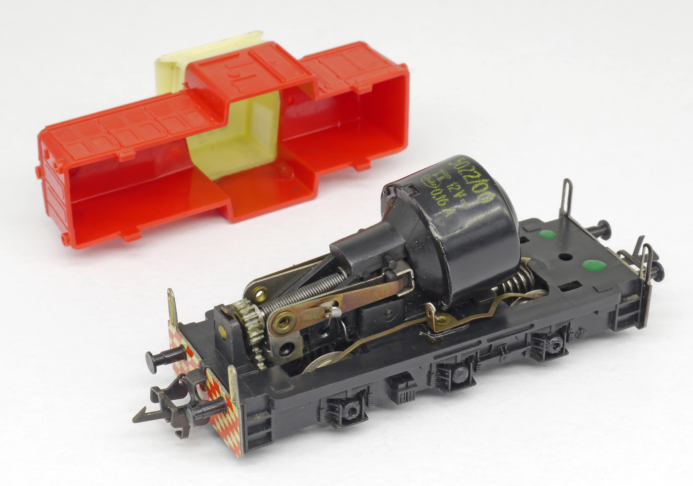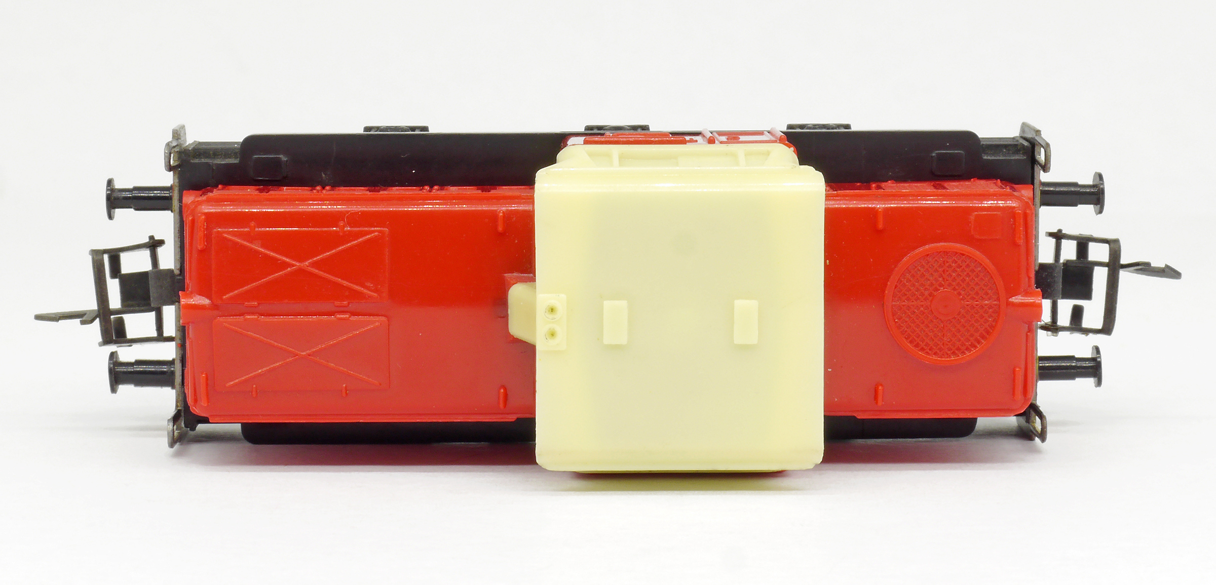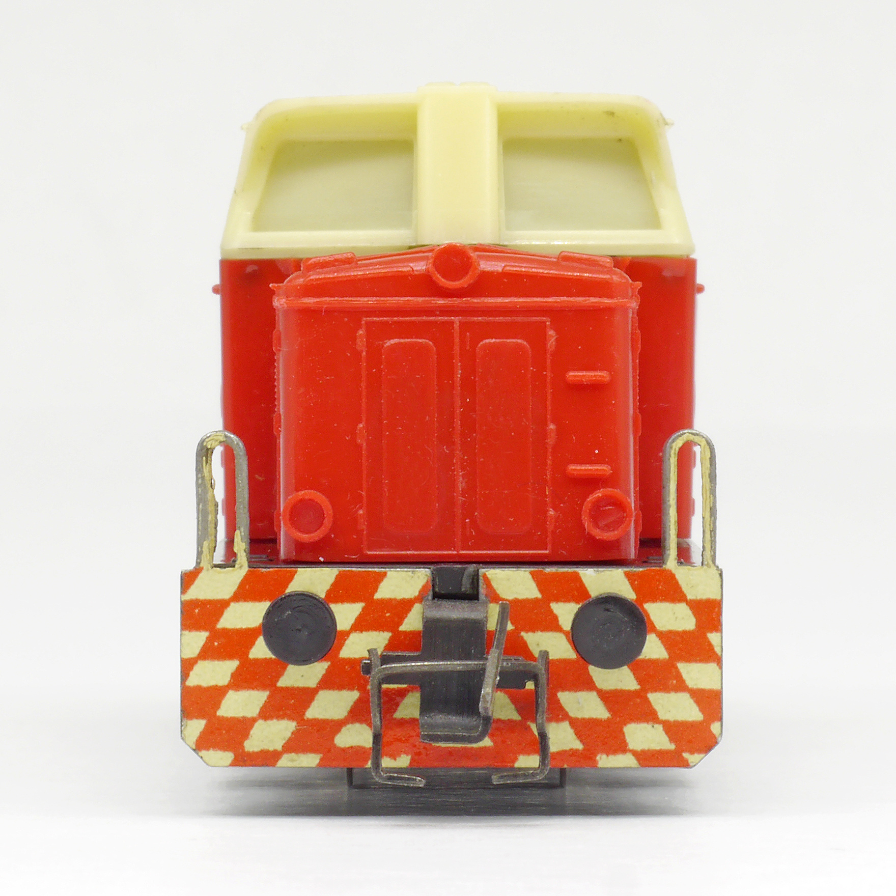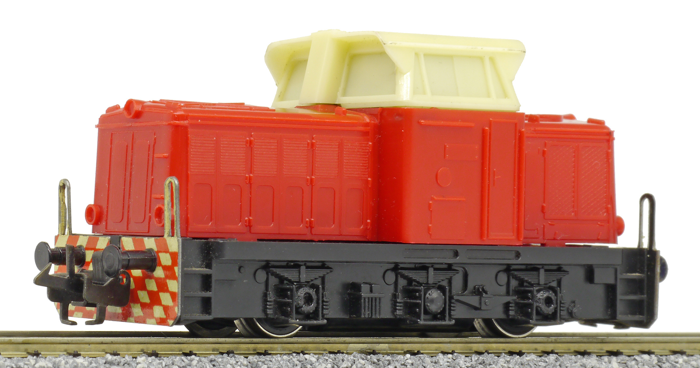 | dieselová lokomotiva v barvě plastu červená s černým pojezdem |