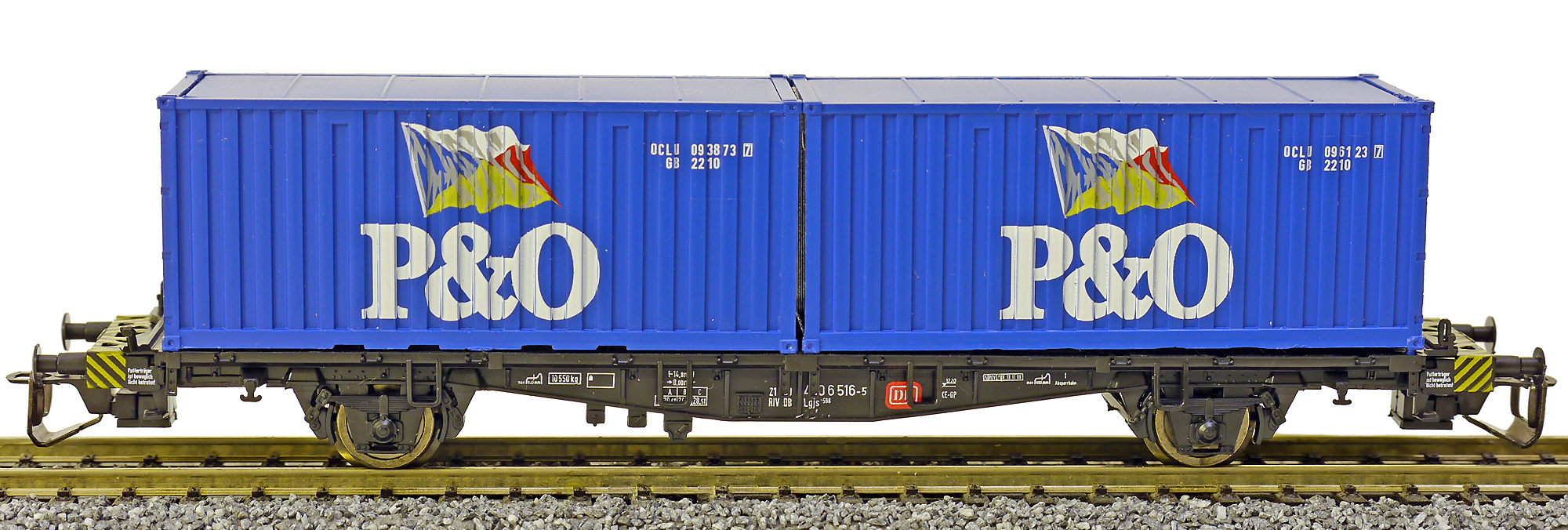 | plošinový nákladní vůz černý se dvěma kontejnery 20' „P&O“ |
