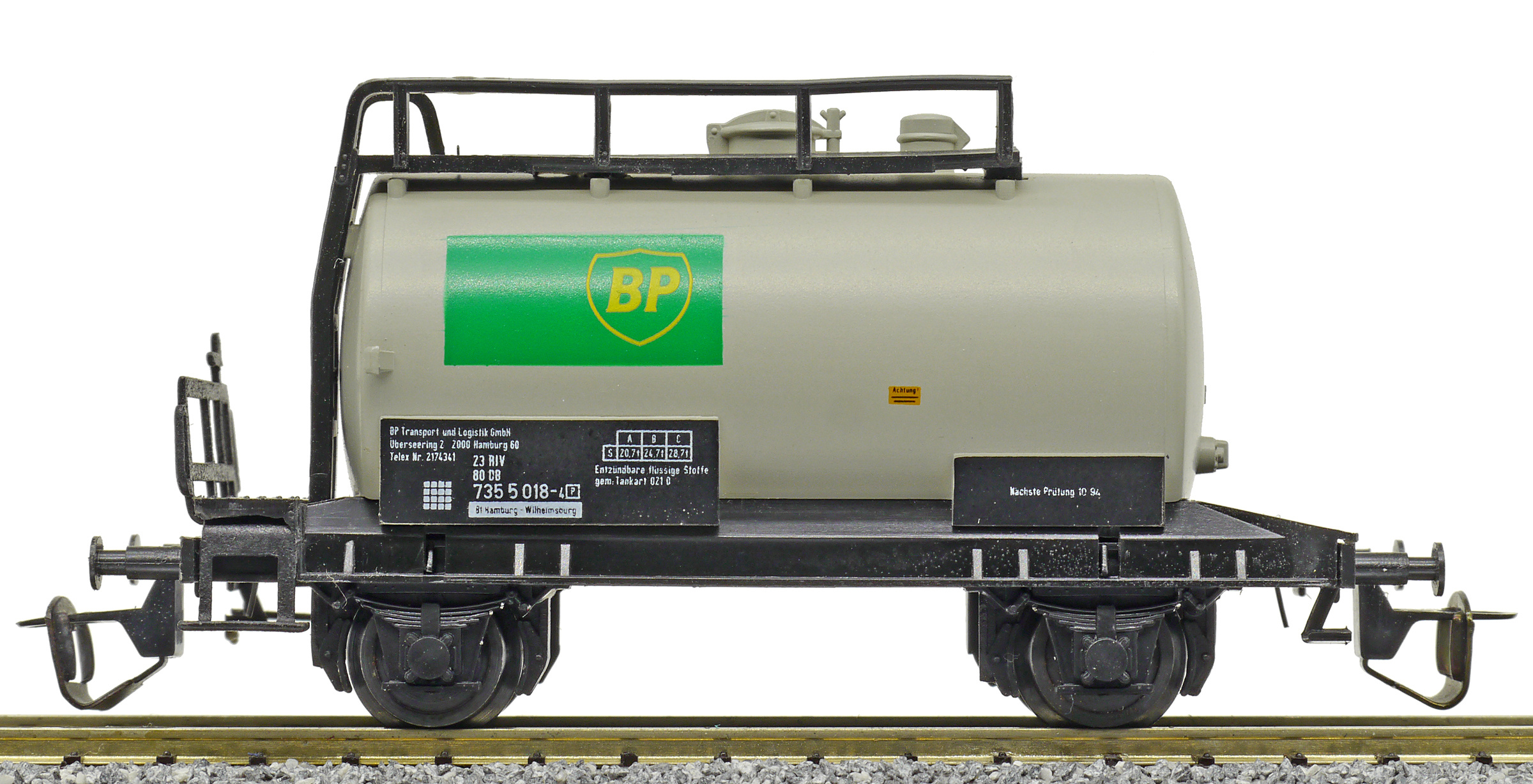 cisternový vůz světle šedý s černým rámem „BP“