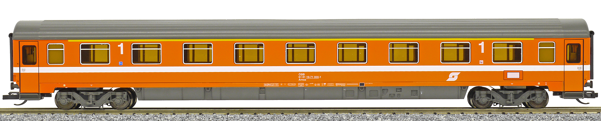 rychlíkový vůz oranžovo-červený s šedou střechou 1. tř.
