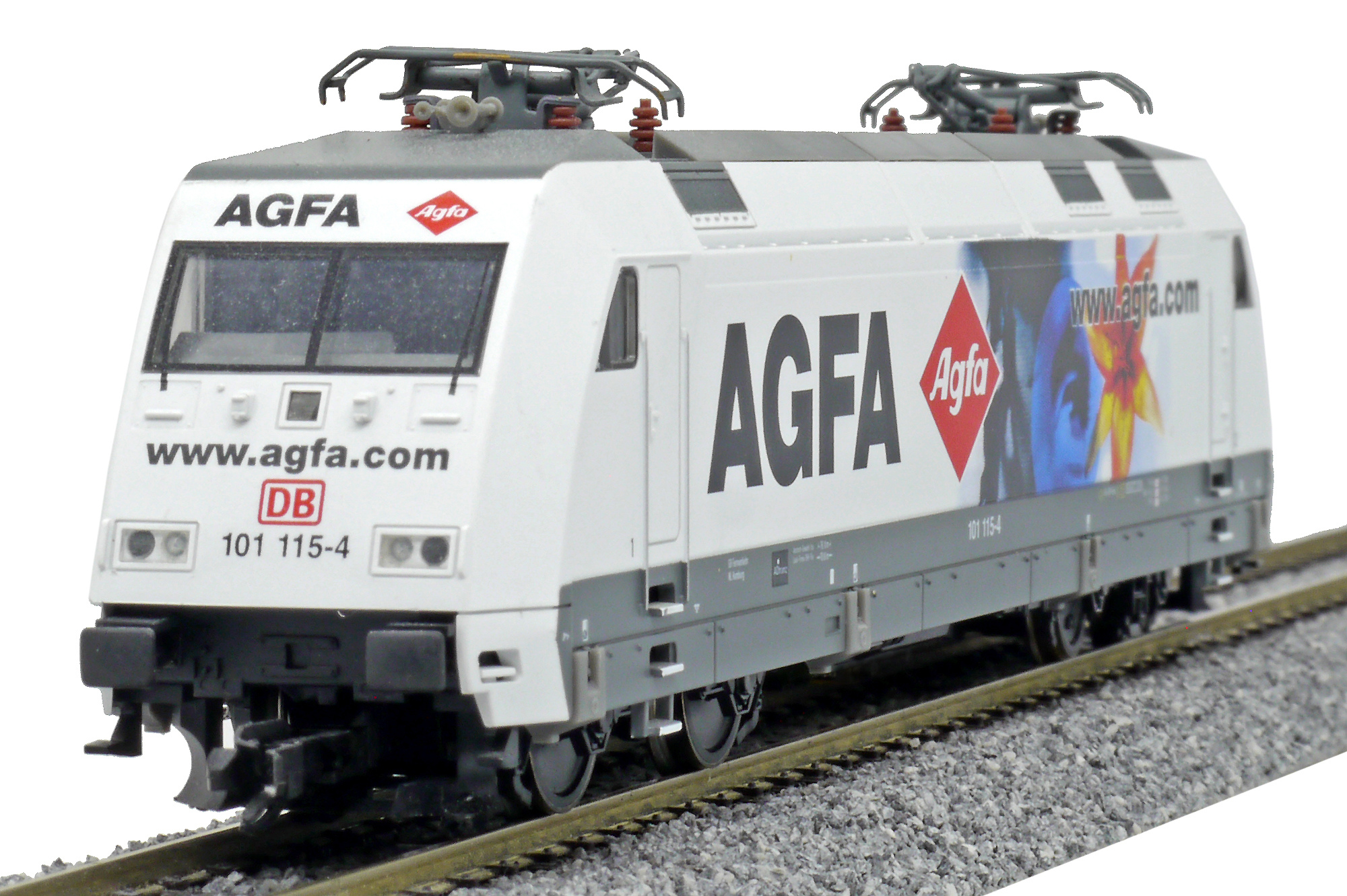 Popis   elektrická lokomotiva bílá s šedým rámem a reklamním potiskem „AGFA“