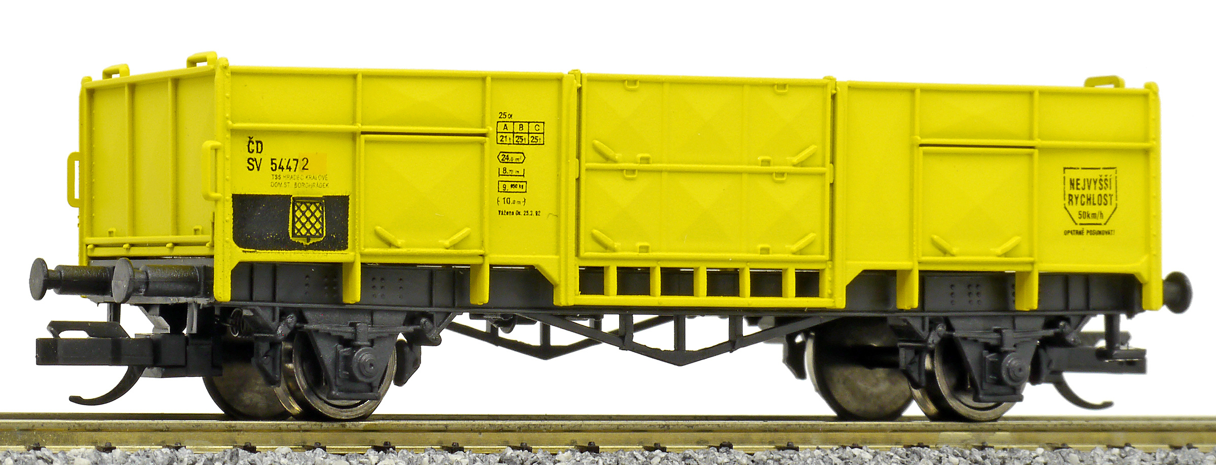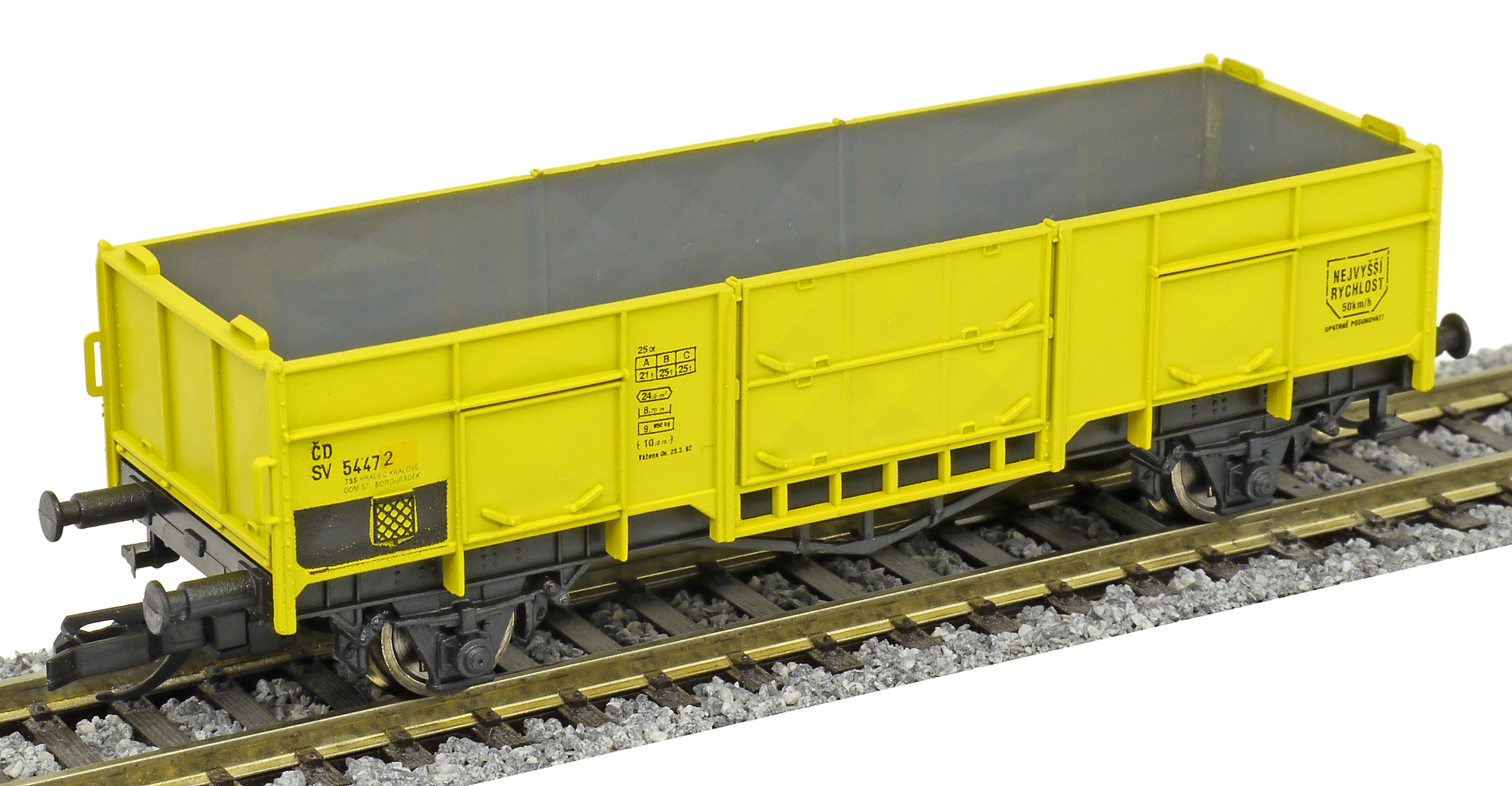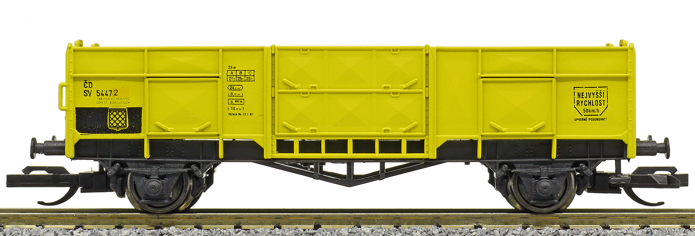 měřítko 1:120 - rozchod kolejí 12 mm nenormované uchycení spřáhla 83 mm - celková délka modelu přes nárazníky 2 - celkový počet náprav nebo rozložení náprav 45 g - hmotnost brutto - model včetně prodejního obalu 20 g - hmotnost netto - pouze model
