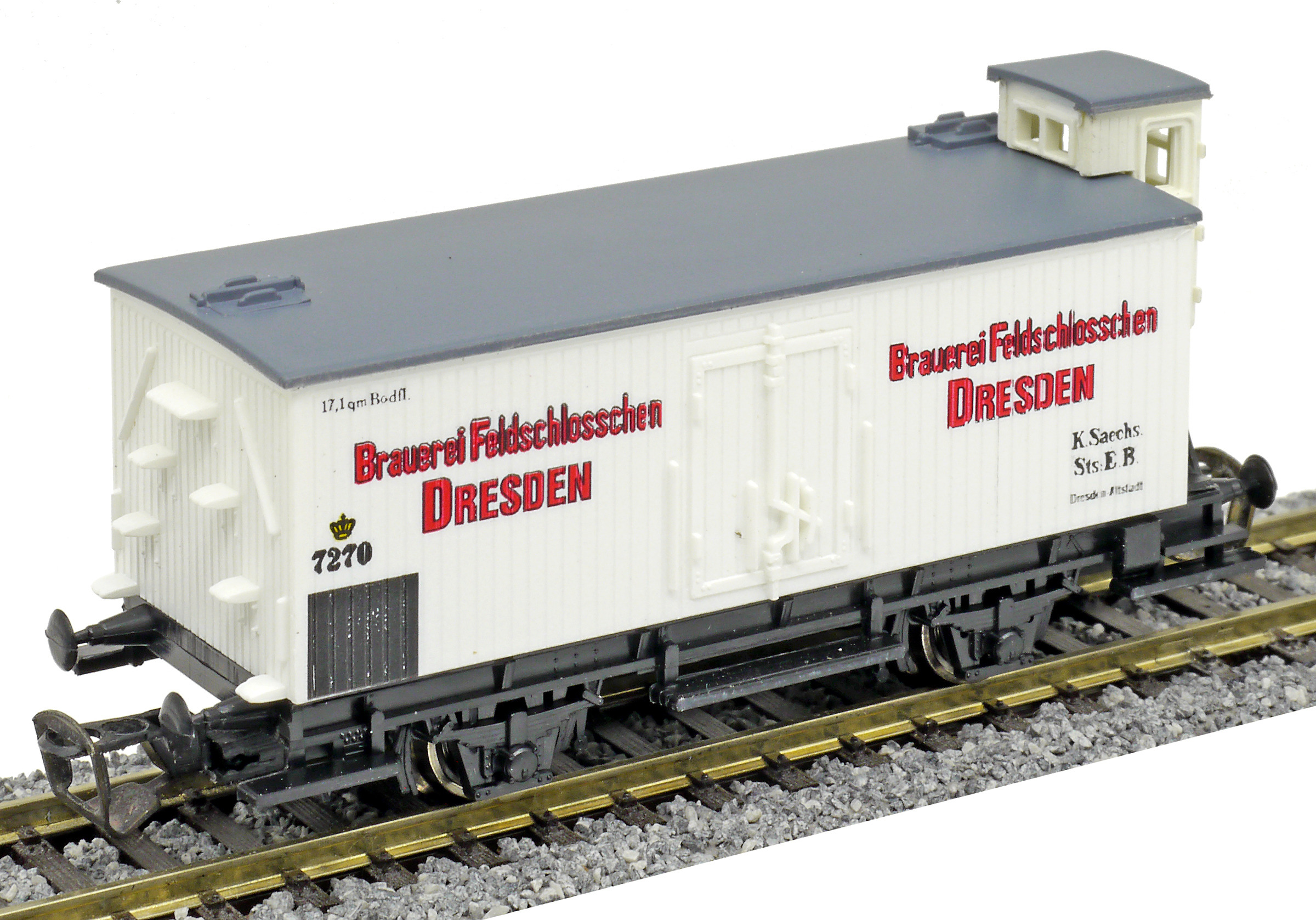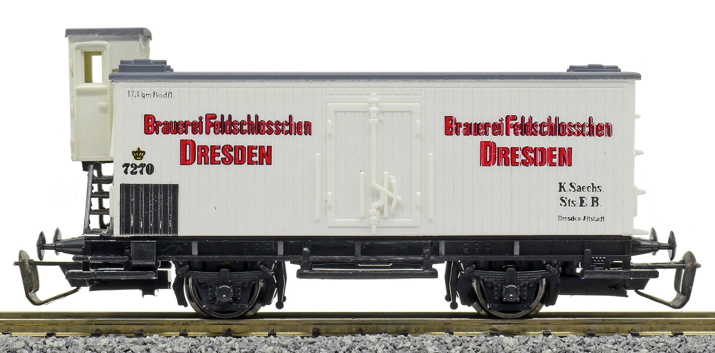 | nákladní chladící vůz bílý s šedou střechou a brzdařskou budkou „Feldschlösschen“ |