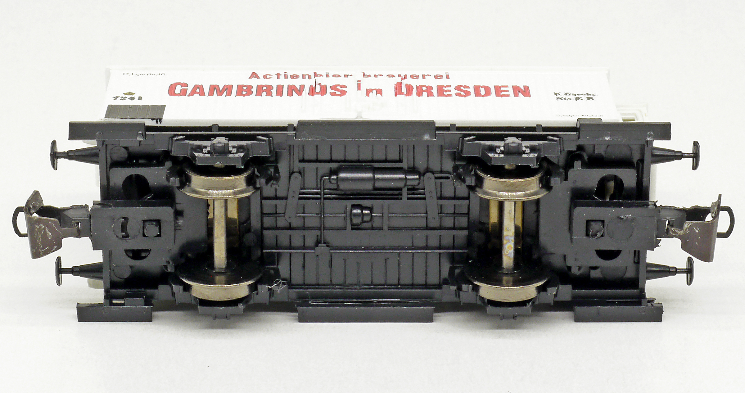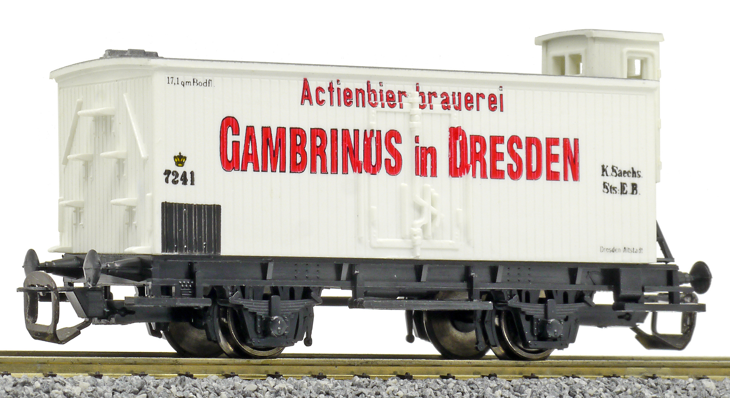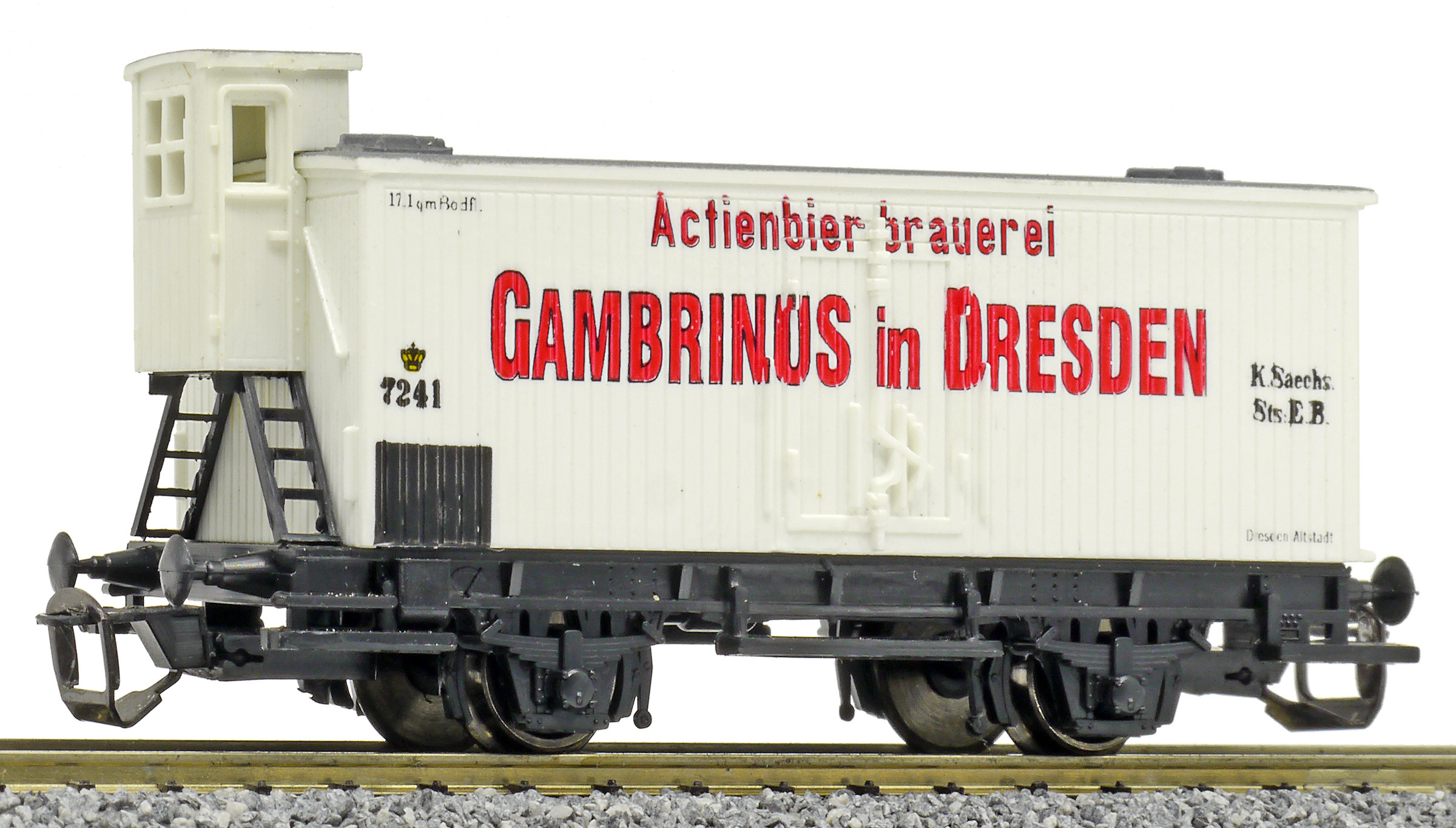 | nákladní chladící vůz bílý s šedou střechou a brzdařskou budkou „Gambrinus“ |