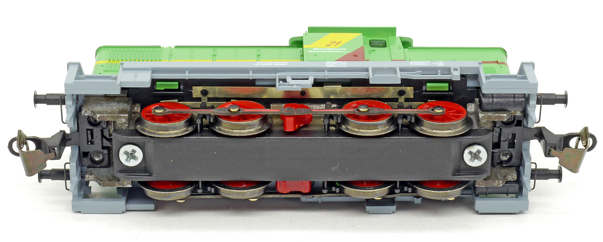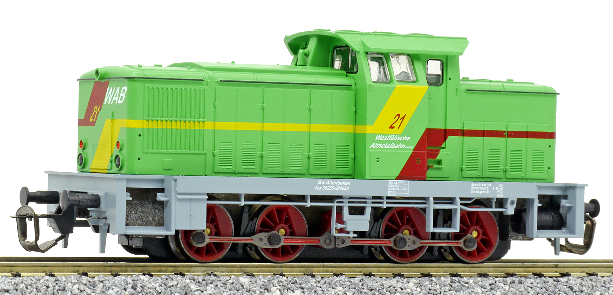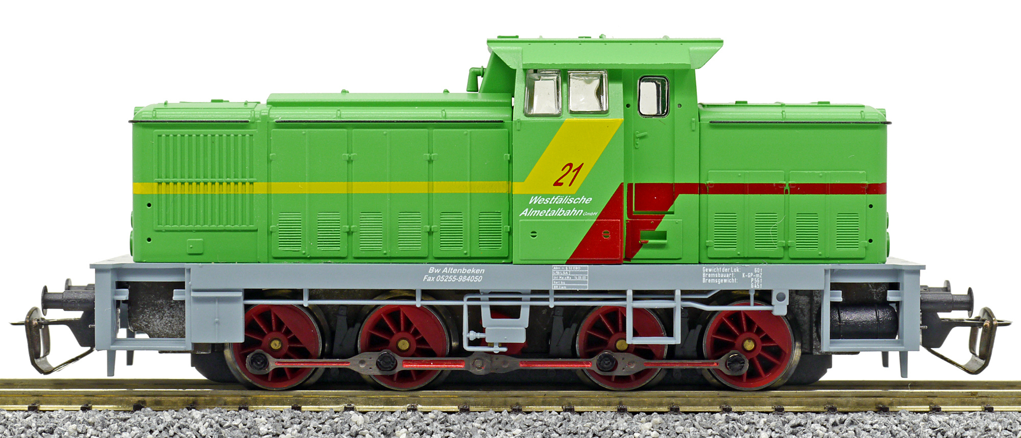 Popis   zelená s šedým rámem a červenými koly "Westf. Almetalbahn" (WAB)