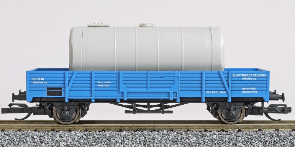 | modrý nářaďový vůz s nákladem cisterny "Elektrizace železnic" |