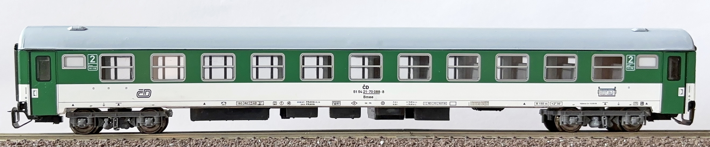 | rychlíkový vůz zelený-bílý s šedou střechou, 2. tř. |