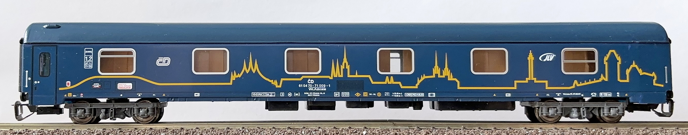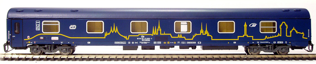 | lůžkový vůz tmavě modrý se siluetou Prahy |