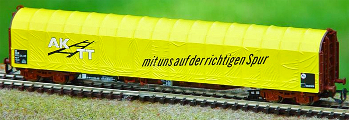 | nákladní vůz červenohnědý se žlutou plachtou „AKTT“ |