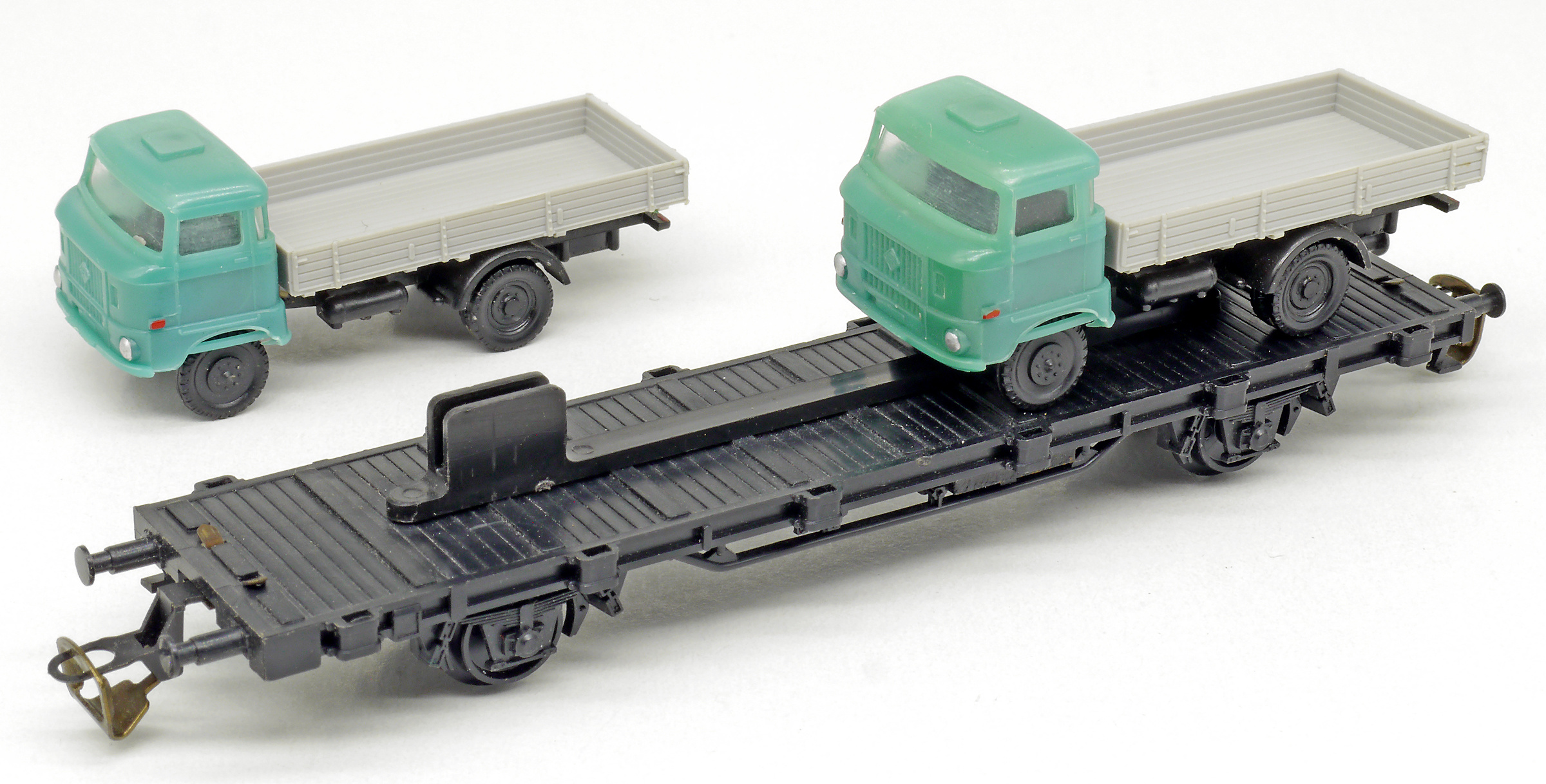 | plošinový vůz černý s nákladem dvou automobilů W50 |