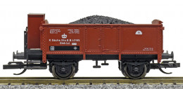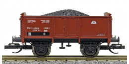 | otevřený nákladní vůz červenohnědý s brzdařskou budkou ložený uhlím |