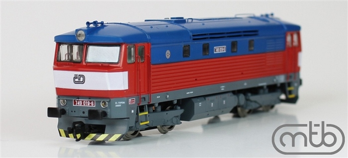 Popis   dieselová lokomotiva červená-modrá s bílým pásem, tmavěšedý rám a podvozky