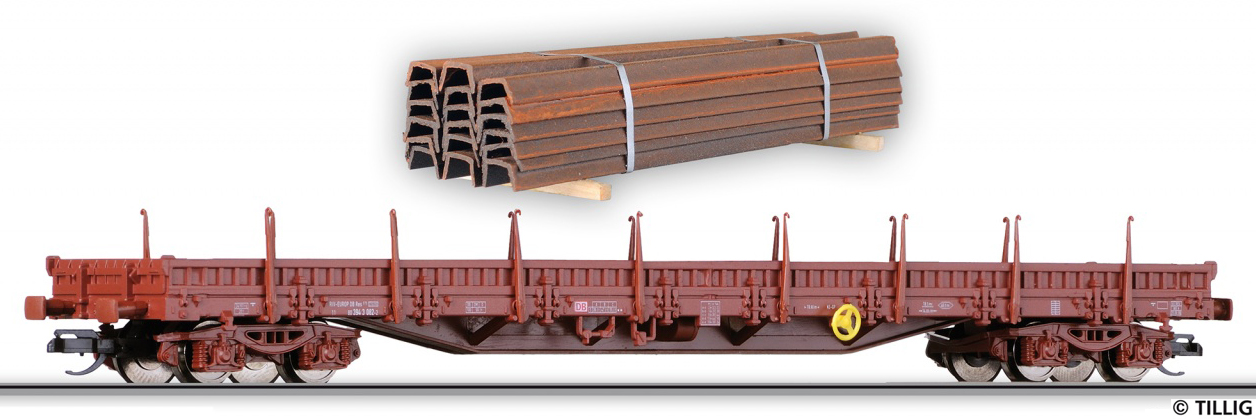 | nízkostěnný nákladní vůz červenohnědý s nákladem ocelových překladů |