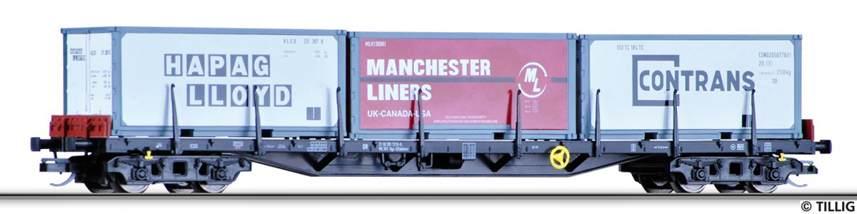 | nákladní plošinový vůz černý s nákladem tří kontejnerů 20' |