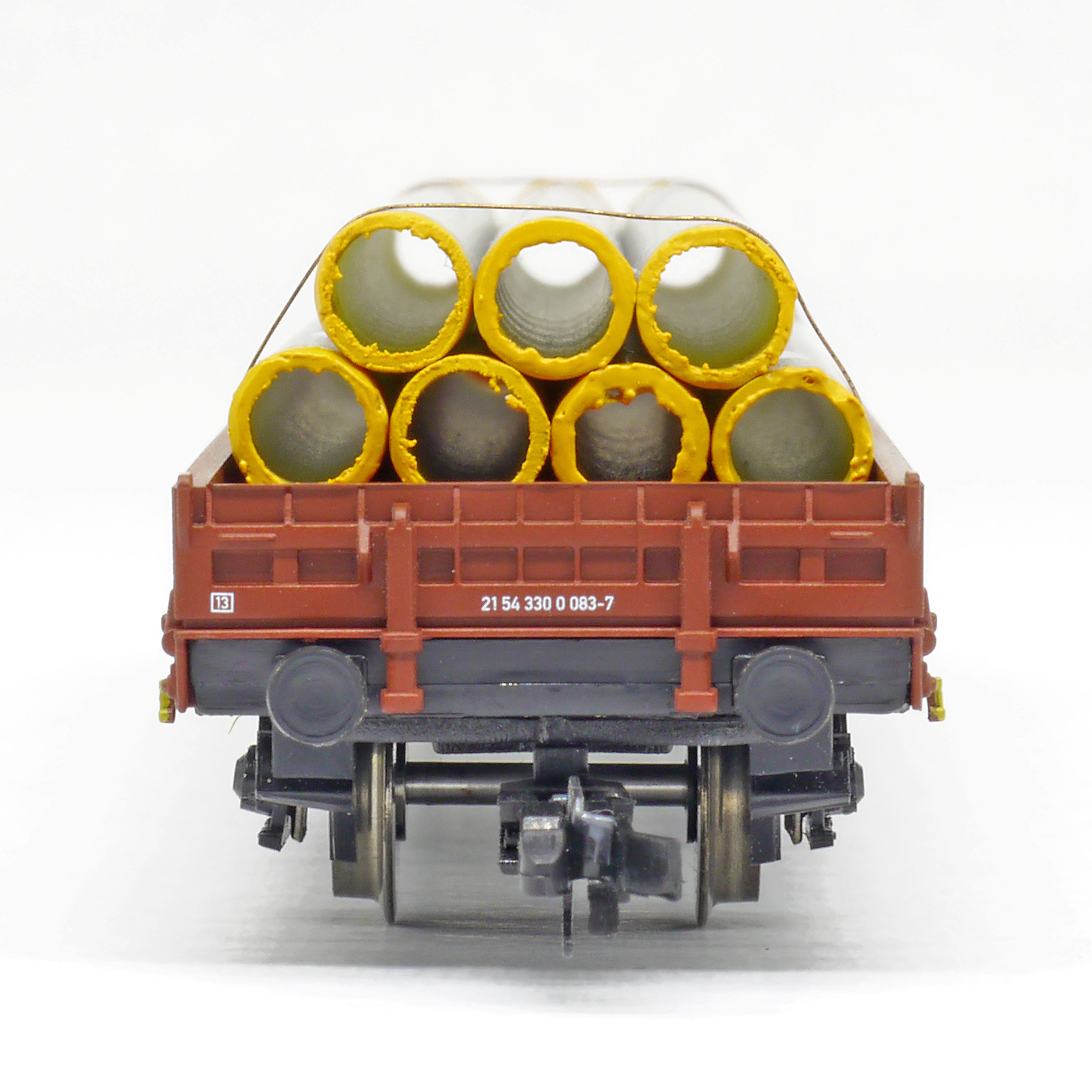 | nízkostěnný nákladní vůz červenohnědý s nákladem rour |