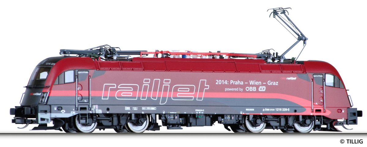 Popis   elektrická lokomotiva Railjet v barevném schematu „Spirit of Praha“