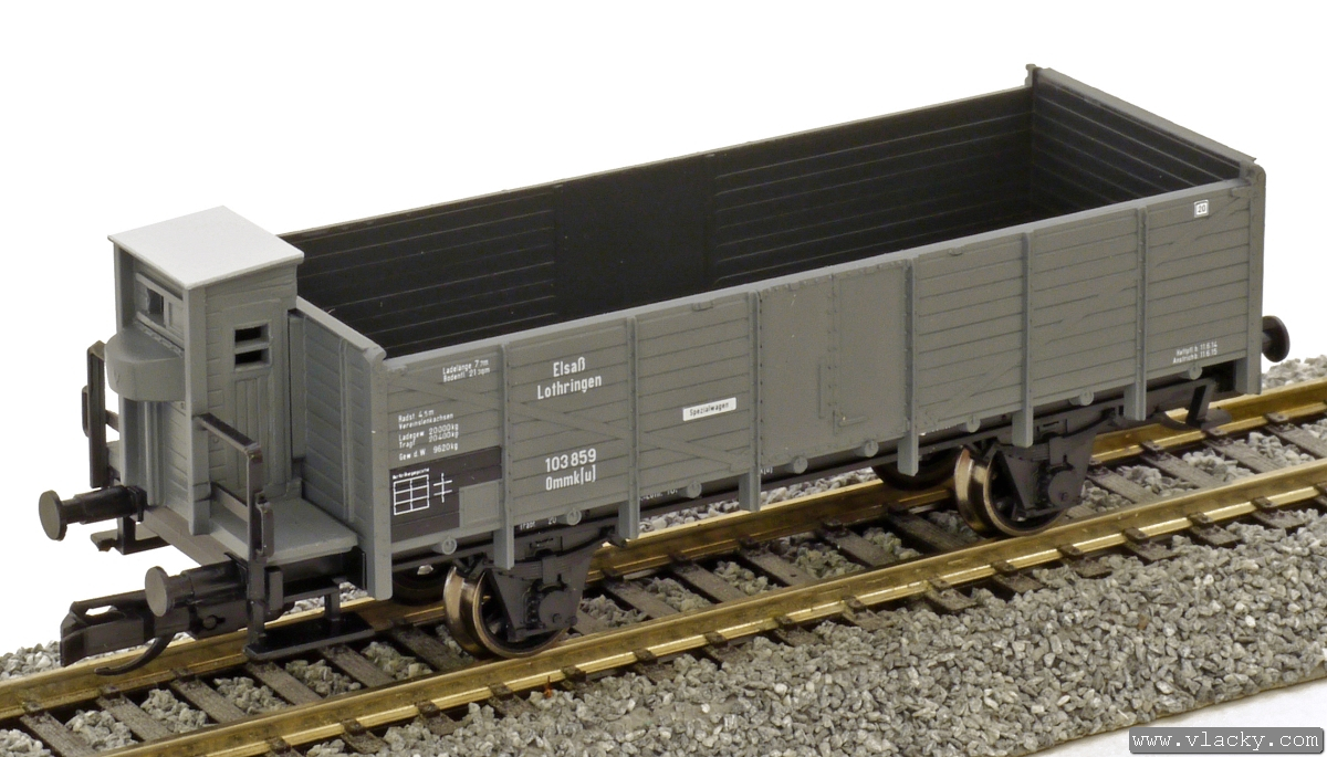 otevřený vůz šedý s loukoťovými koly a s brzdařskou budkou