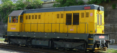 | dieselová lokomotiva žlutá, černý rám a střecha |