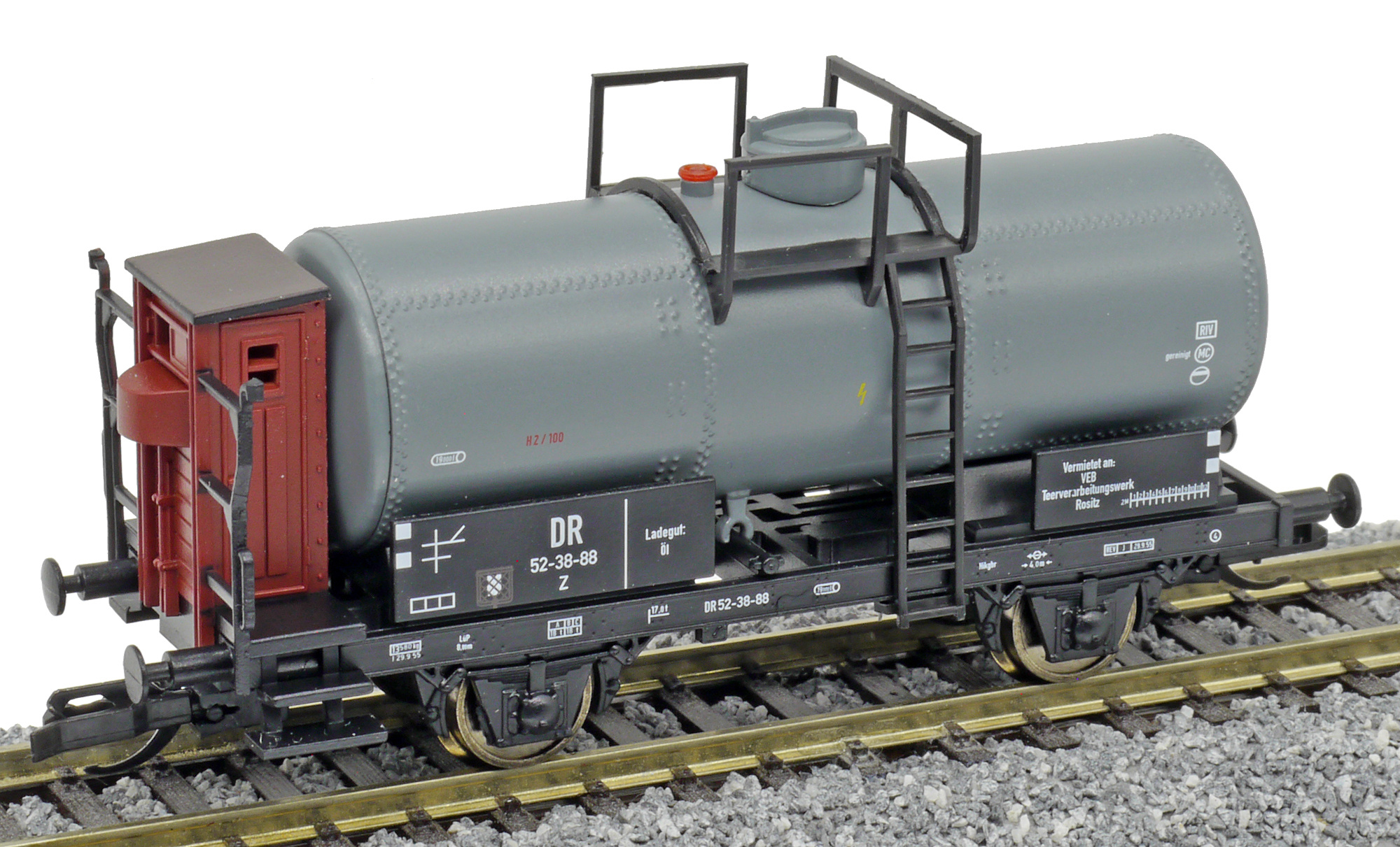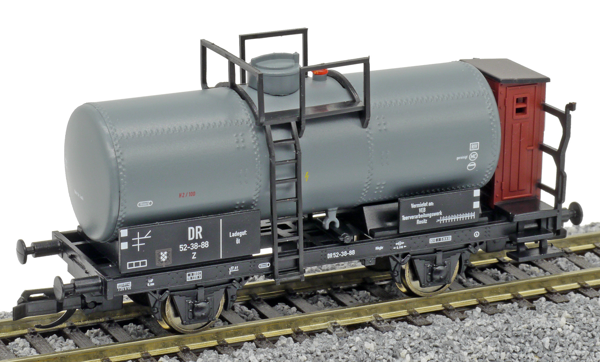 | cisternový vůz světle šedý s brzdařskou budkou |