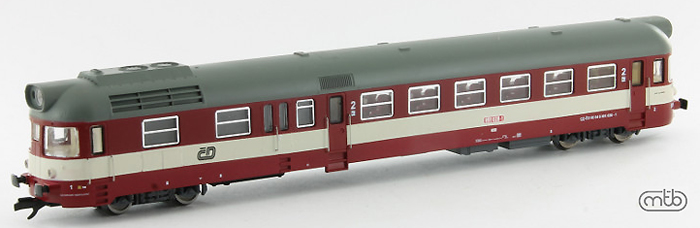 | motorový vůz červený s krémovým pruhem, šedá střecha |