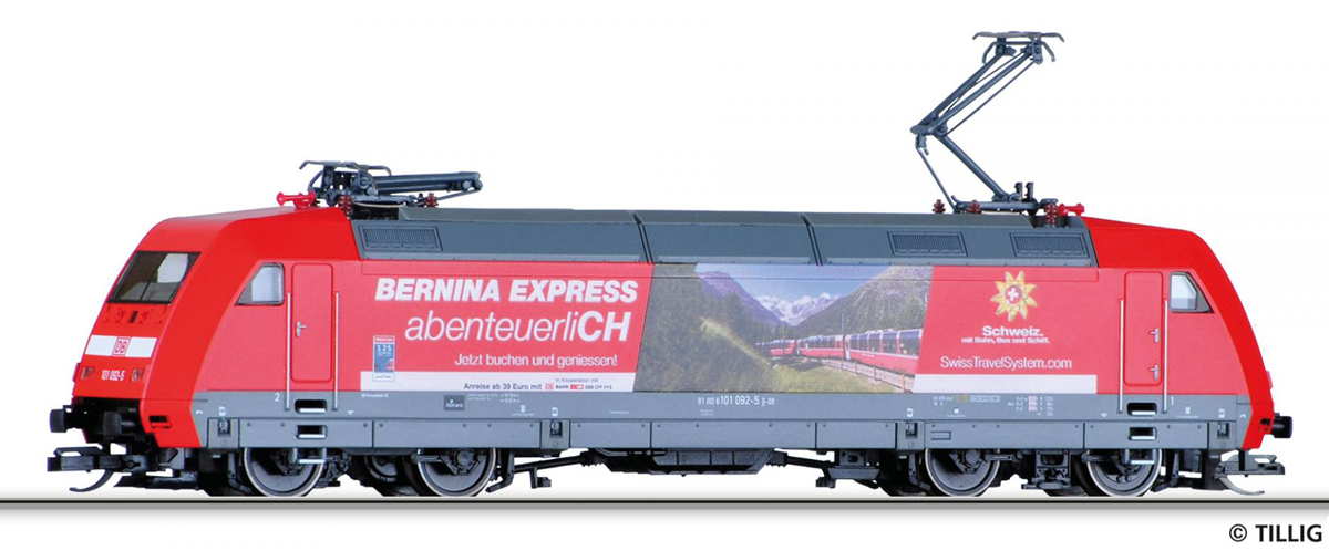 | elektrická lokomotiva červená s potiskem „Bernina Express abenteuerlich“ |