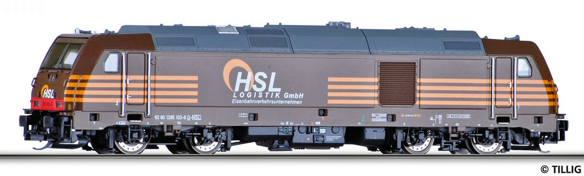 | dieselová lokomotiva hnědá s šedou střechou a logem „HSL Logistik GmbH“ |