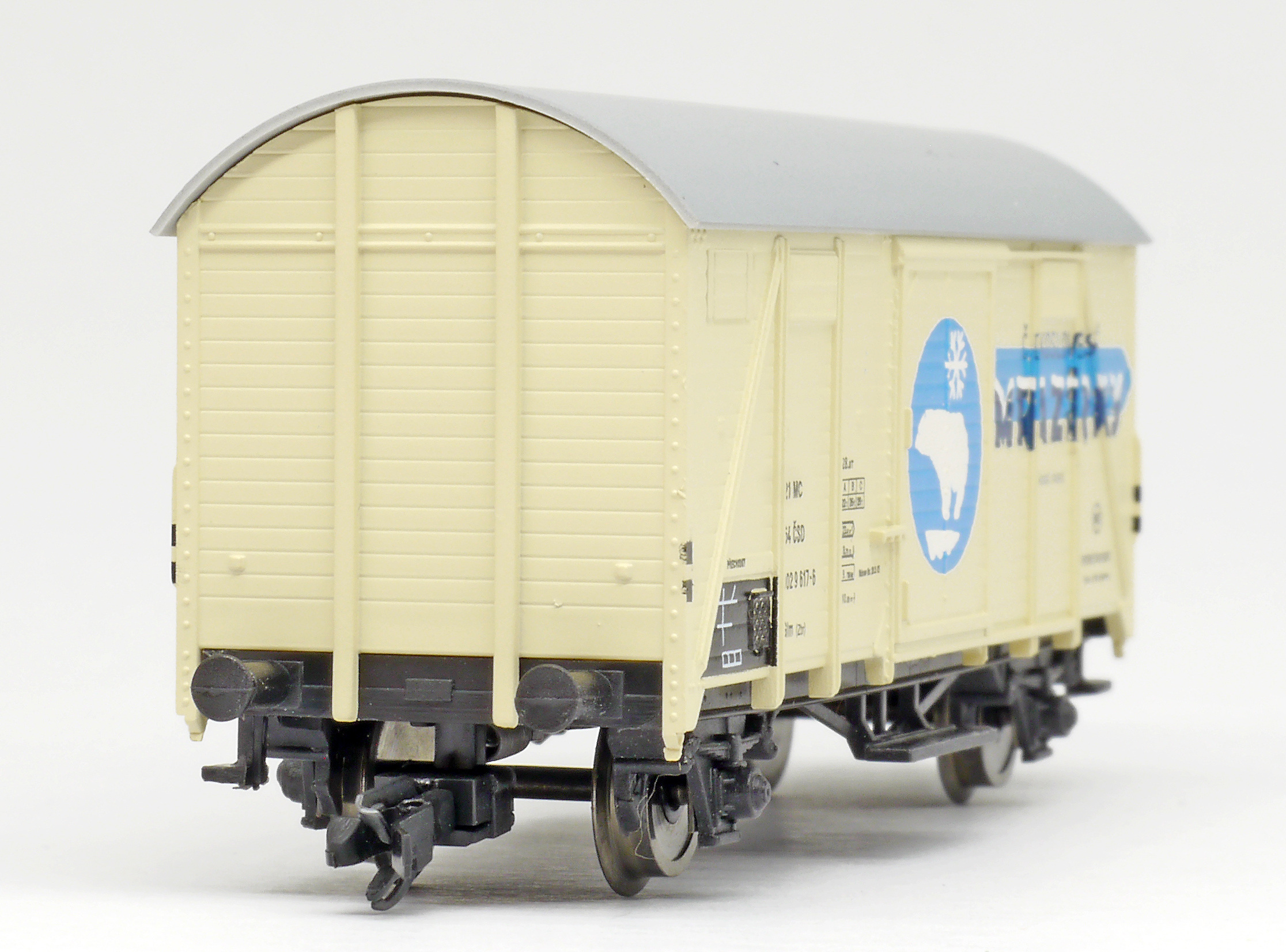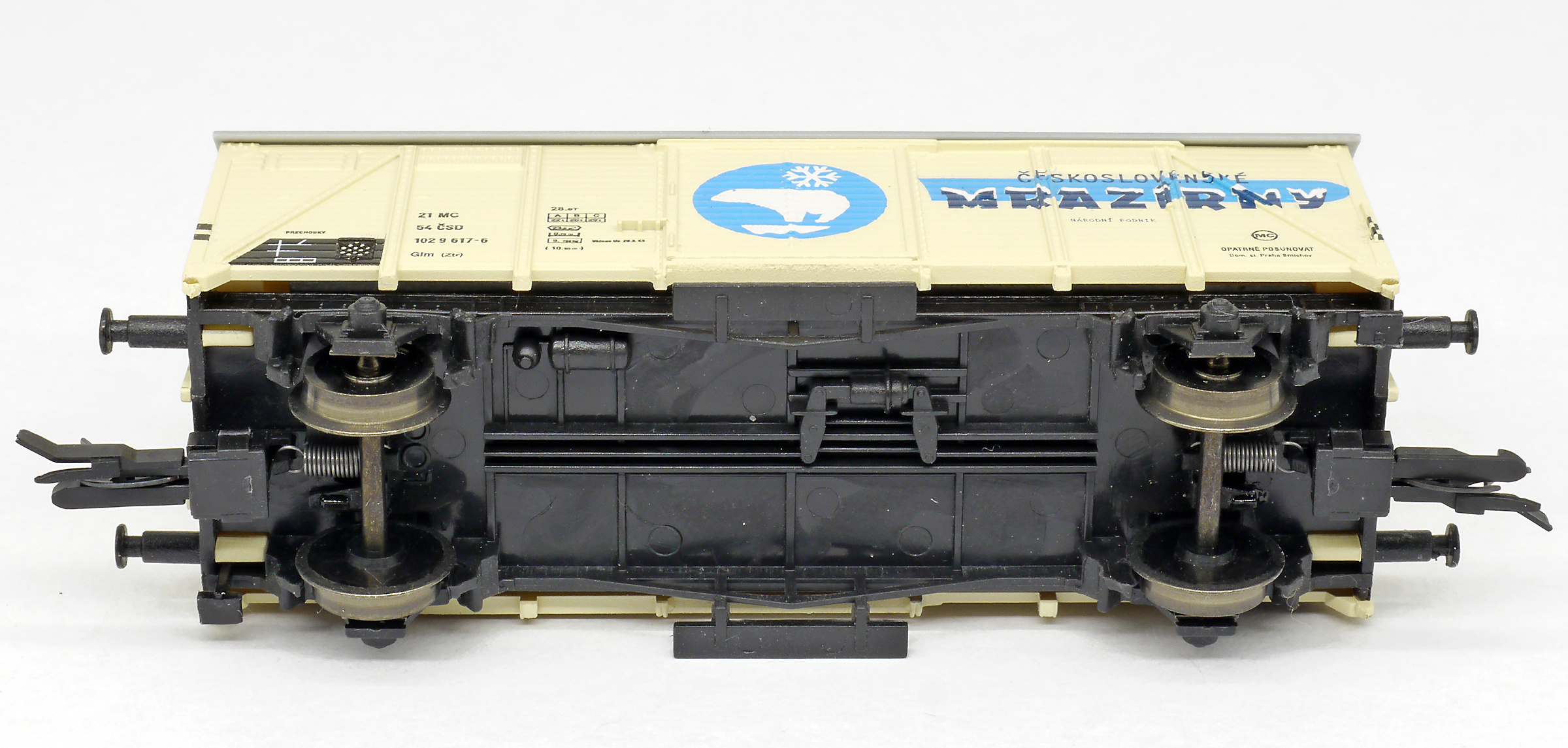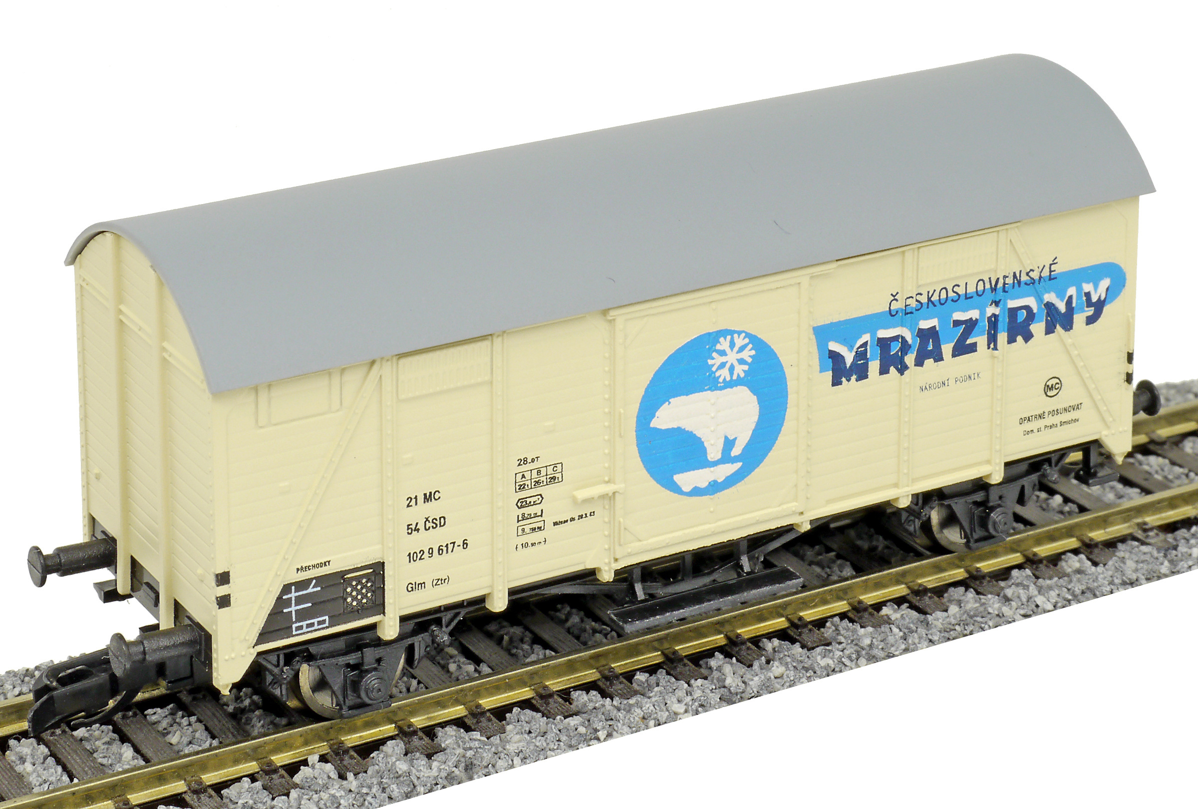 | krytý nákladní vůz krémový s šedou střechou „Československé mrazírny”, logo medvěd |