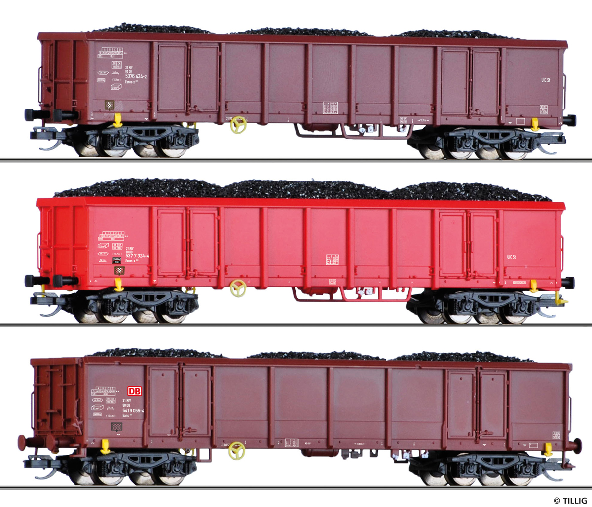 | set tří otevřených vysokostěnných vozů s nákladem uhlí |