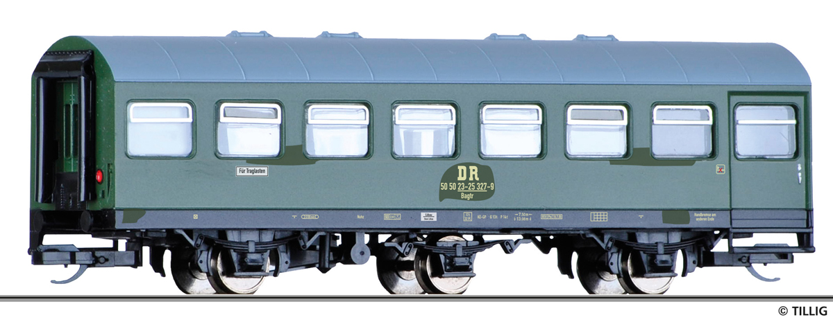 | rekonstruovaný zavazadlový vůz zelený s šedou střechou a záplatami |