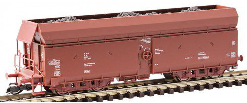 | samovýsypný vůz červenohnědý s nákladem uhlí |