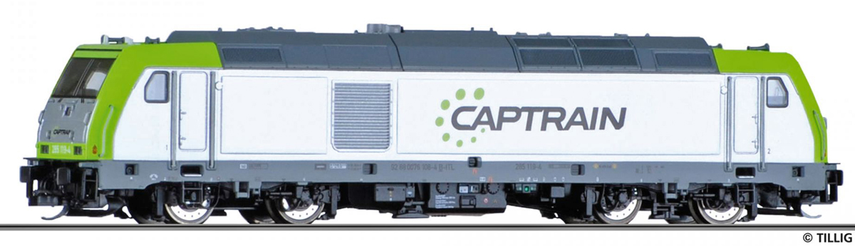 | dieselová lokomotiva bílá-zelená, šedá střecha, rám a pojezd „CAPTRAIN“ |
