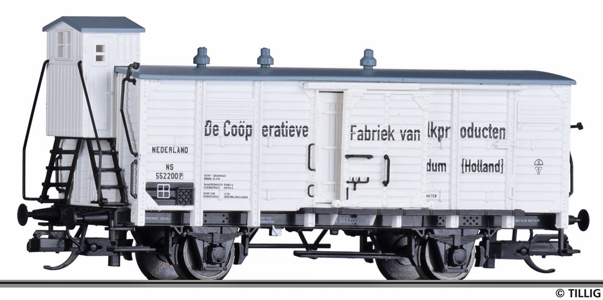 | tepelně izolovaný vůz bílý s šedou střechou „Cooperatieve Fabriek van Melkproducten“ |