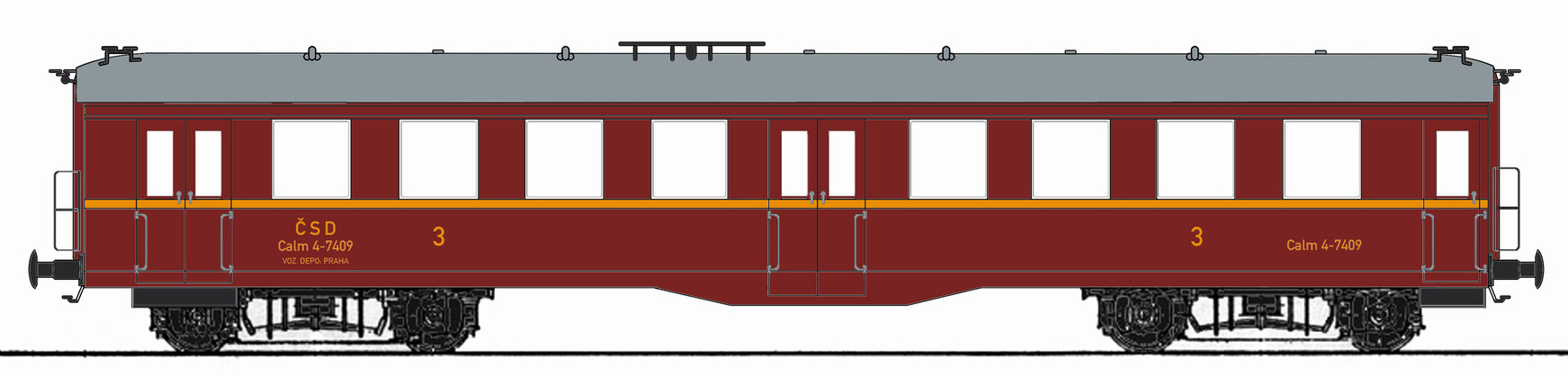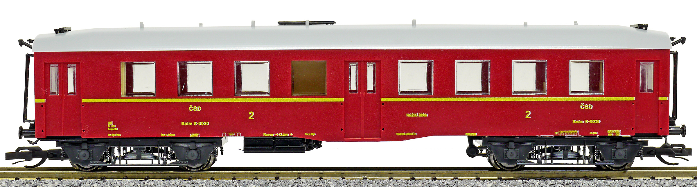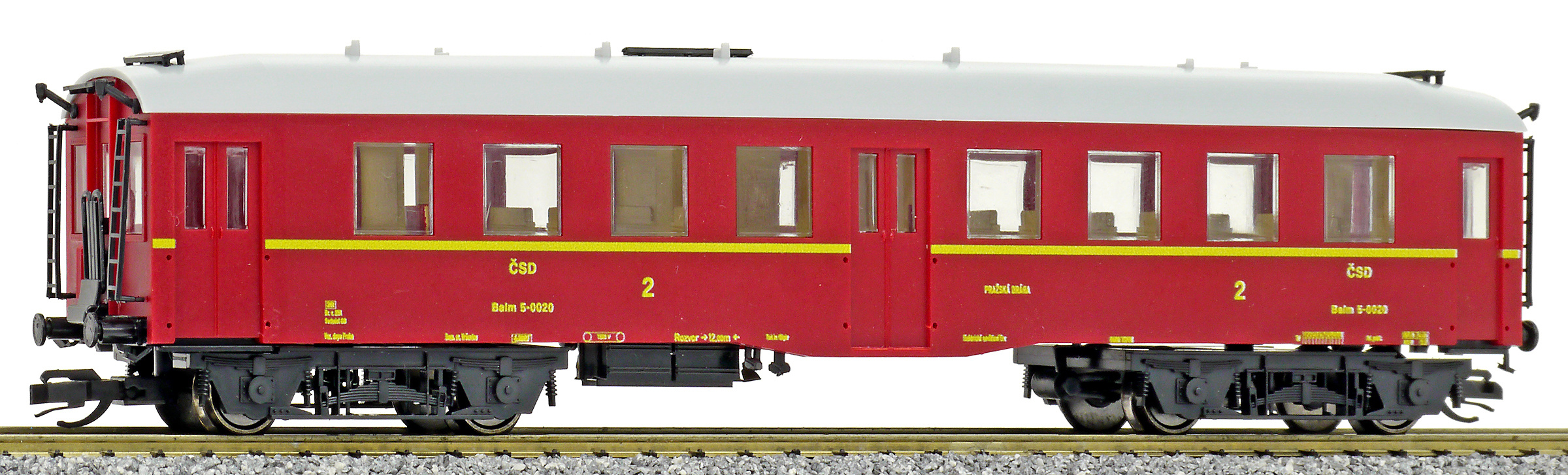 | osobní vůz červený s šedou střechou 2. tř. |