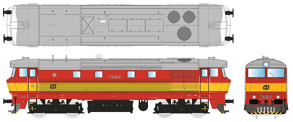 | dieselová lokomotiva červená s výstražným pruhem, šedá střecha, DKV Plzeň |