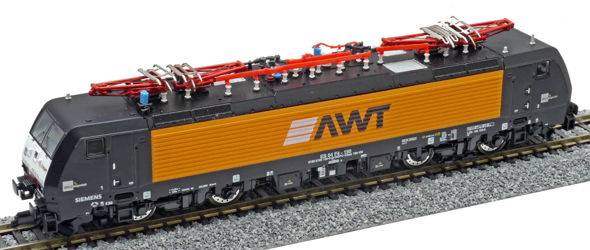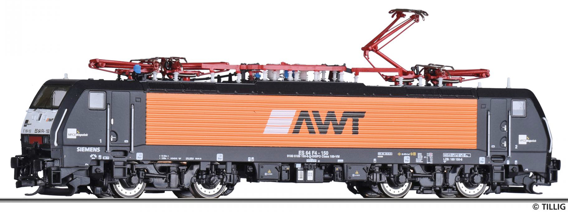 | elektrická lokomotiva černá-oranžová s logem „AWT“ |