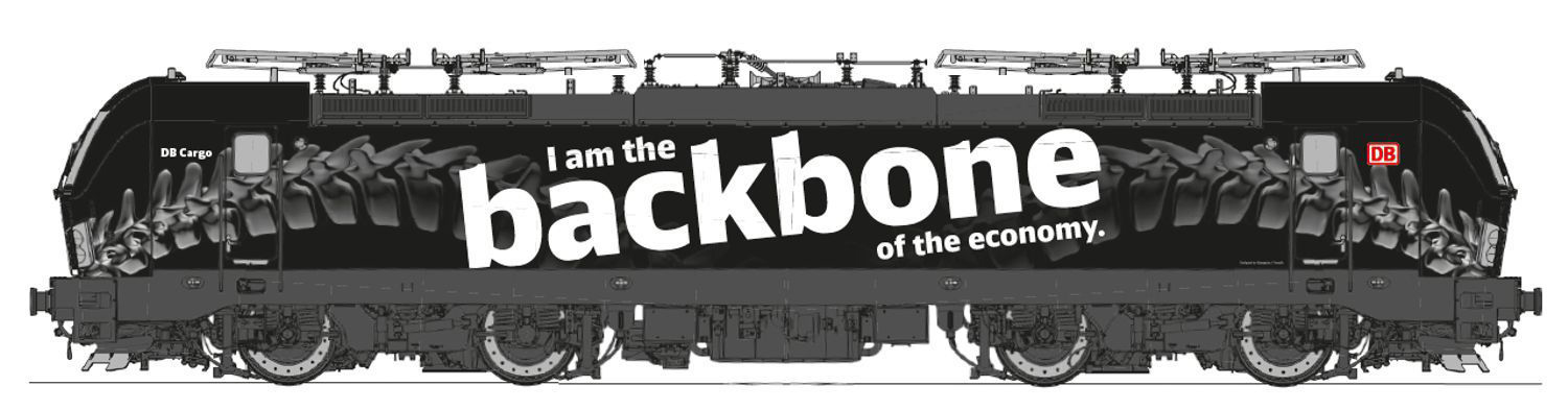 | elektrická lokomotiva s reklamním potiskem „I am the backbone of the economy“ |