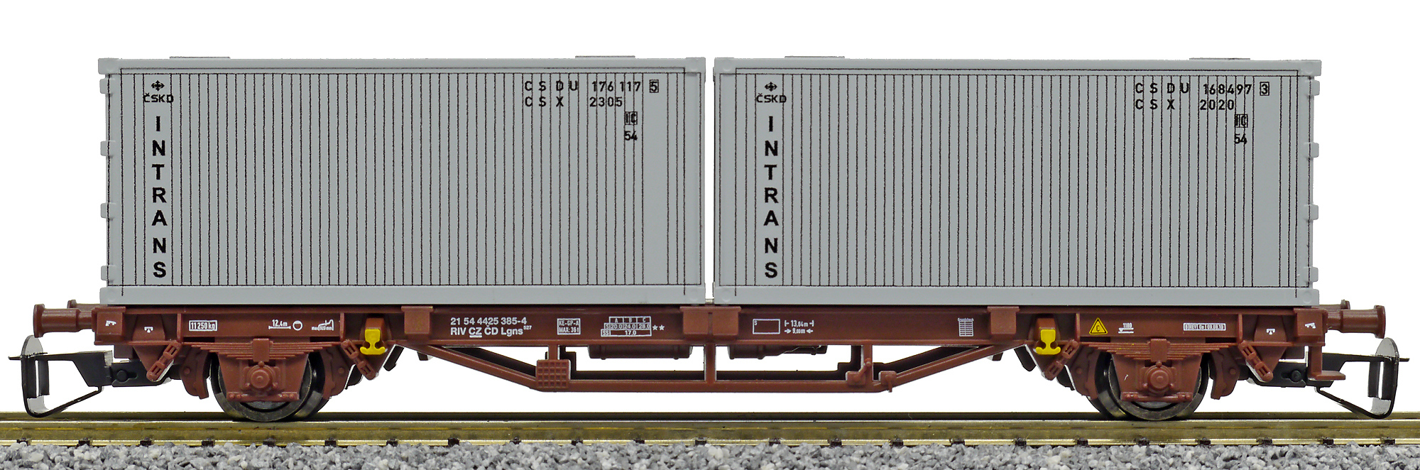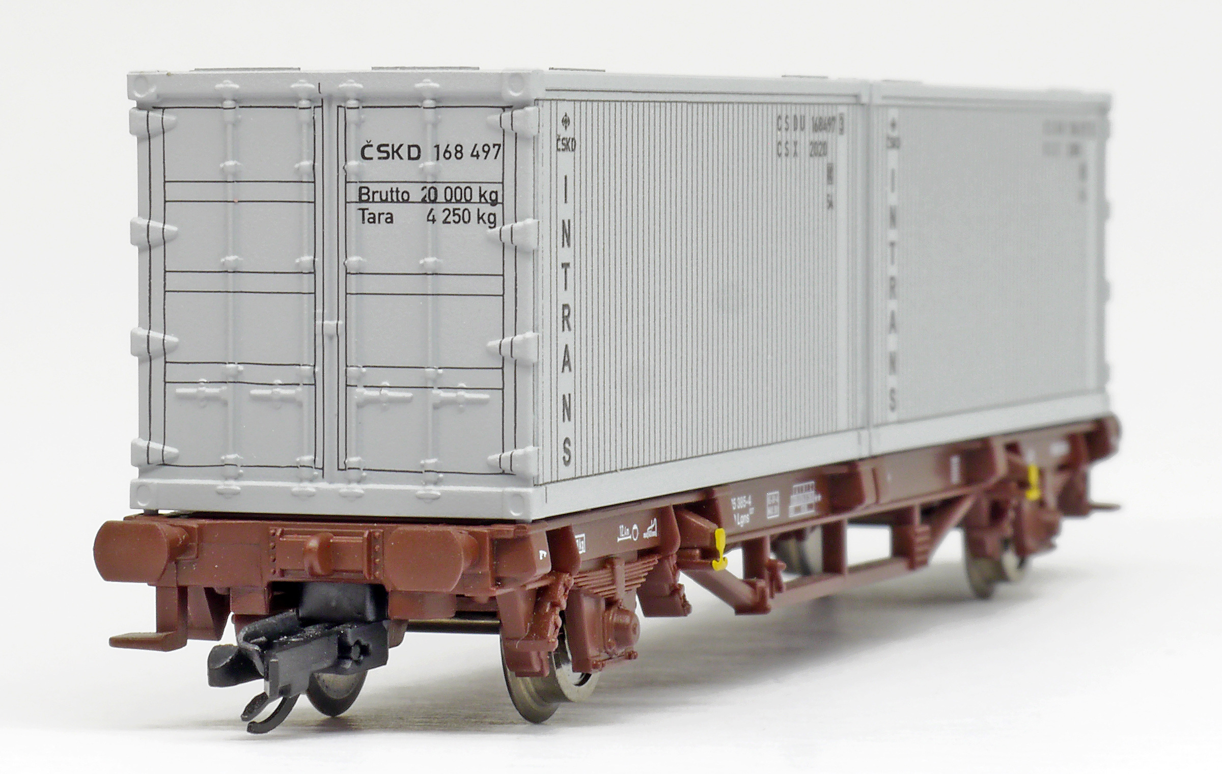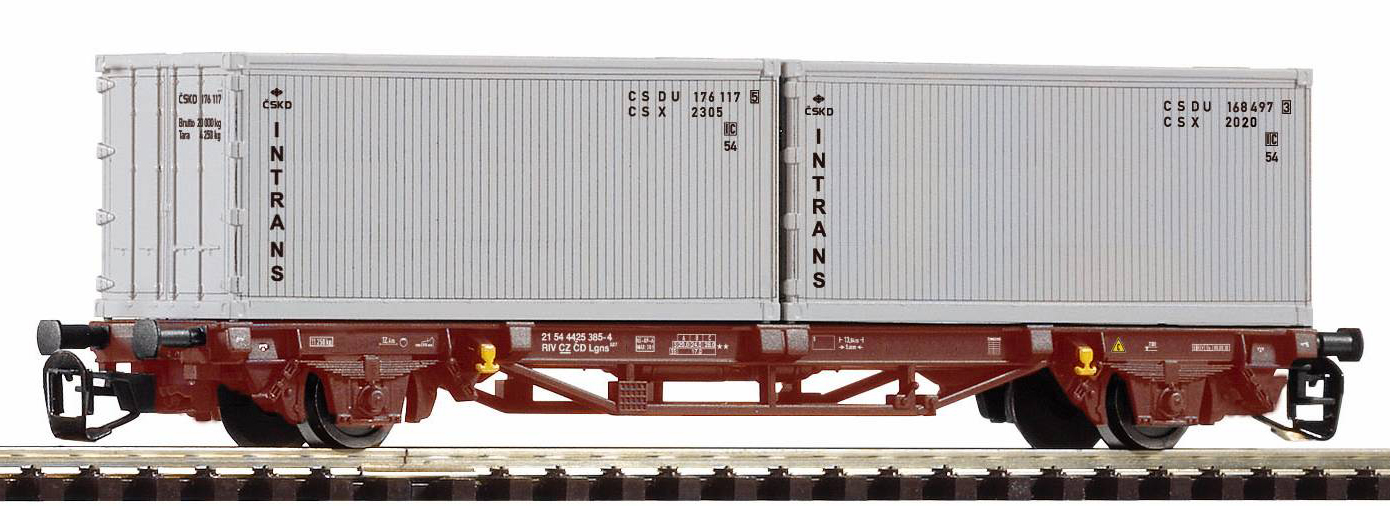 | plošinový vůz červenohnědý s nákladem 2x20' kontejneru „Intrans“ |