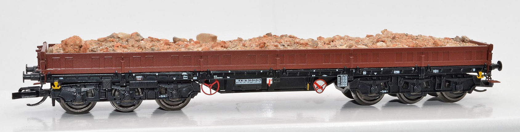 | nízkostěnný nákladní vůz červenohnědý s nákladem stavební suti |