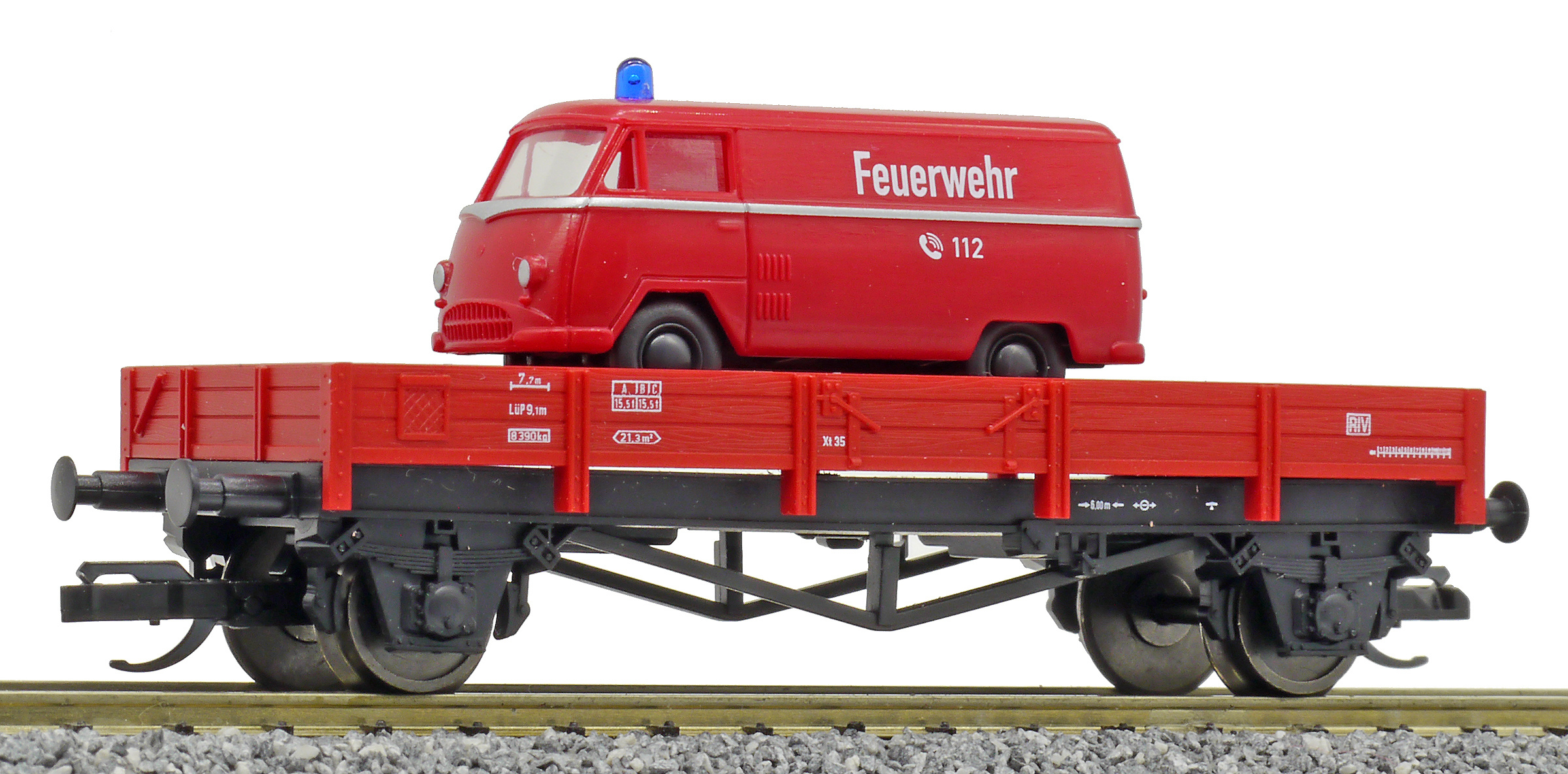 | nízkostěnný nákladní vůz červený ložený dodávkou Matador do požárního vlaku |